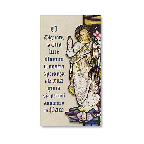 Cette planche de Bénédiction Familiale est délicatement ornée d'impressions dorées à chaud et représente la Résurrection du Christ dans un vitrail artistique. Au verso, le rituel de la Bénédiction des Familles est imprimé en italien.