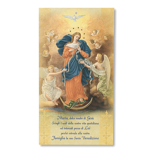 Cette Bénédiction Familiale est délicatement ornée d'impressions dorées à chaud et représente l'image de Marie qui défait les Nœuds. Au verso, est imprimé le rituel de Bénédiction des Familles en italien.