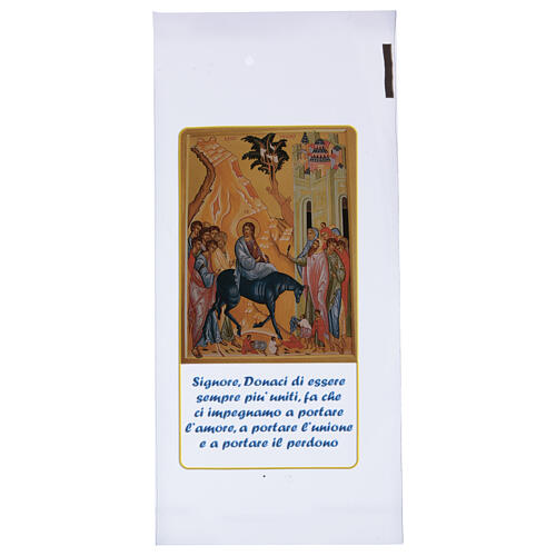 Sachets pour le Dimanche des Rameaux avec l'entrée à Jérusalem représentée et prière en italien. Emballage de 200 pièces.