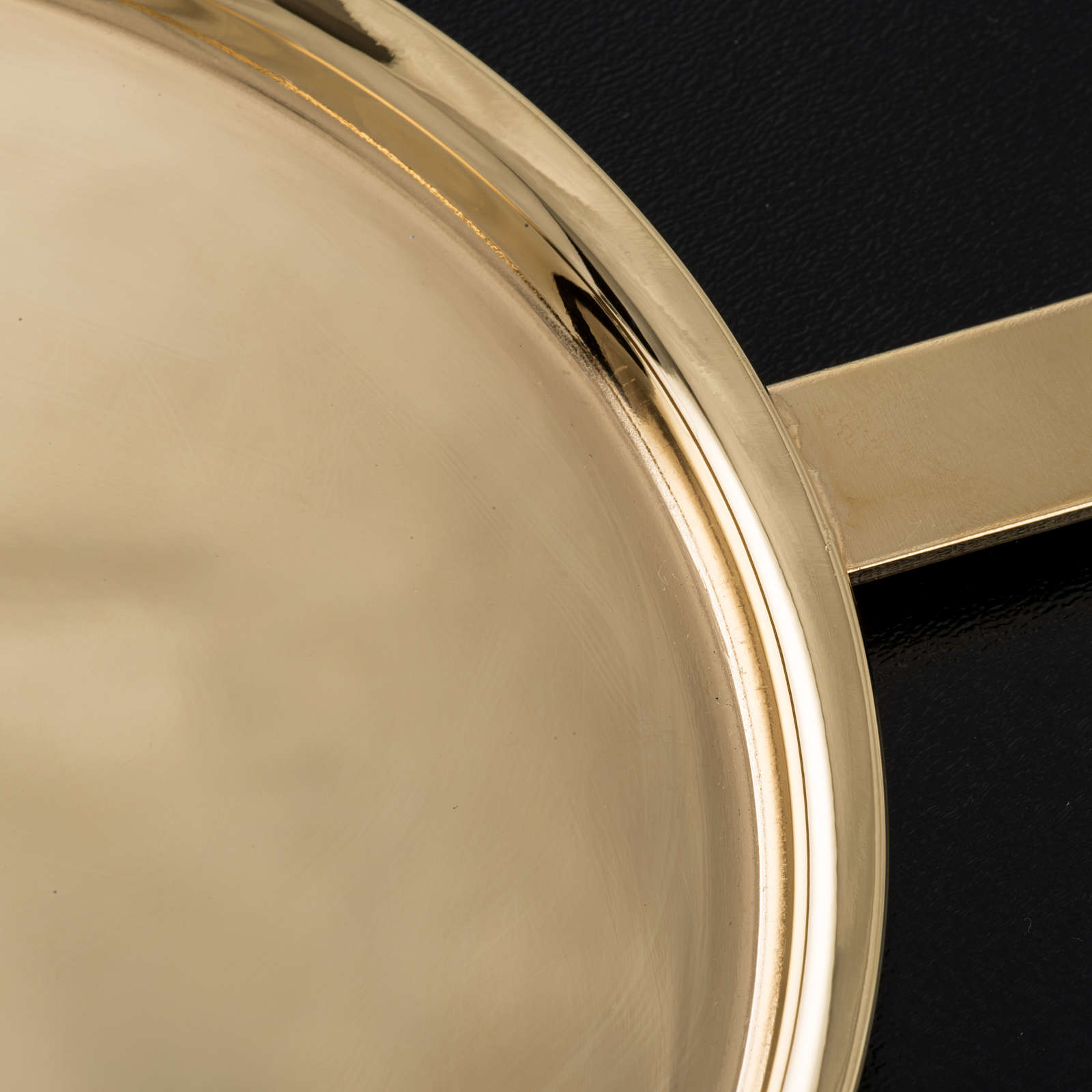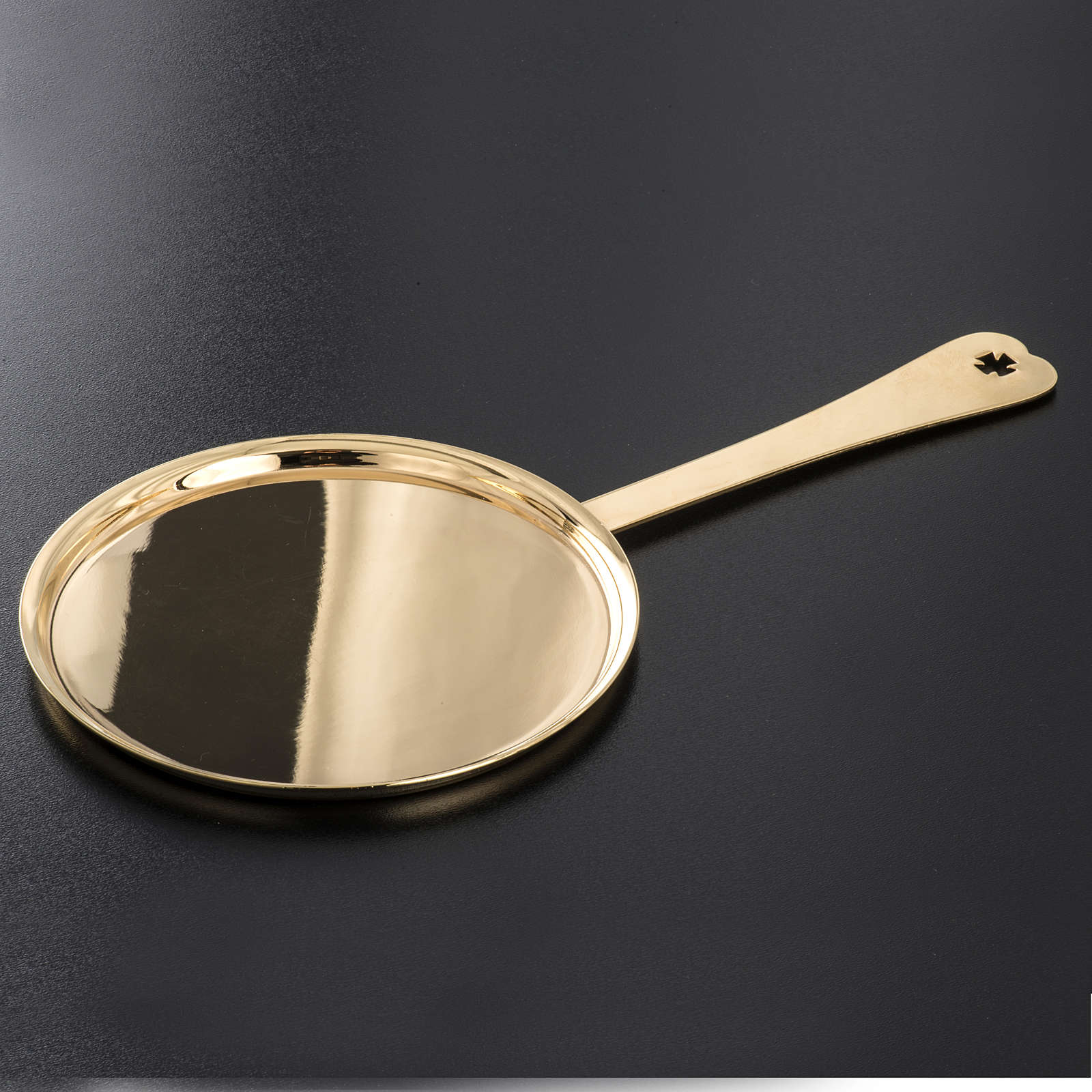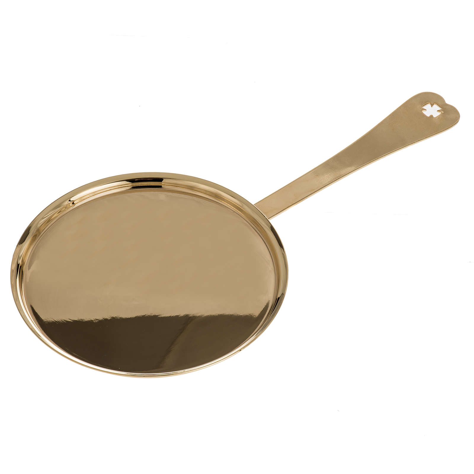 Plateau de communion en laiton doré lucide. Petit assiette léger et pratique réalisée par un artisan italien. Plateau de 14 cm de diamètre et poigné de 8 cm de longueur.