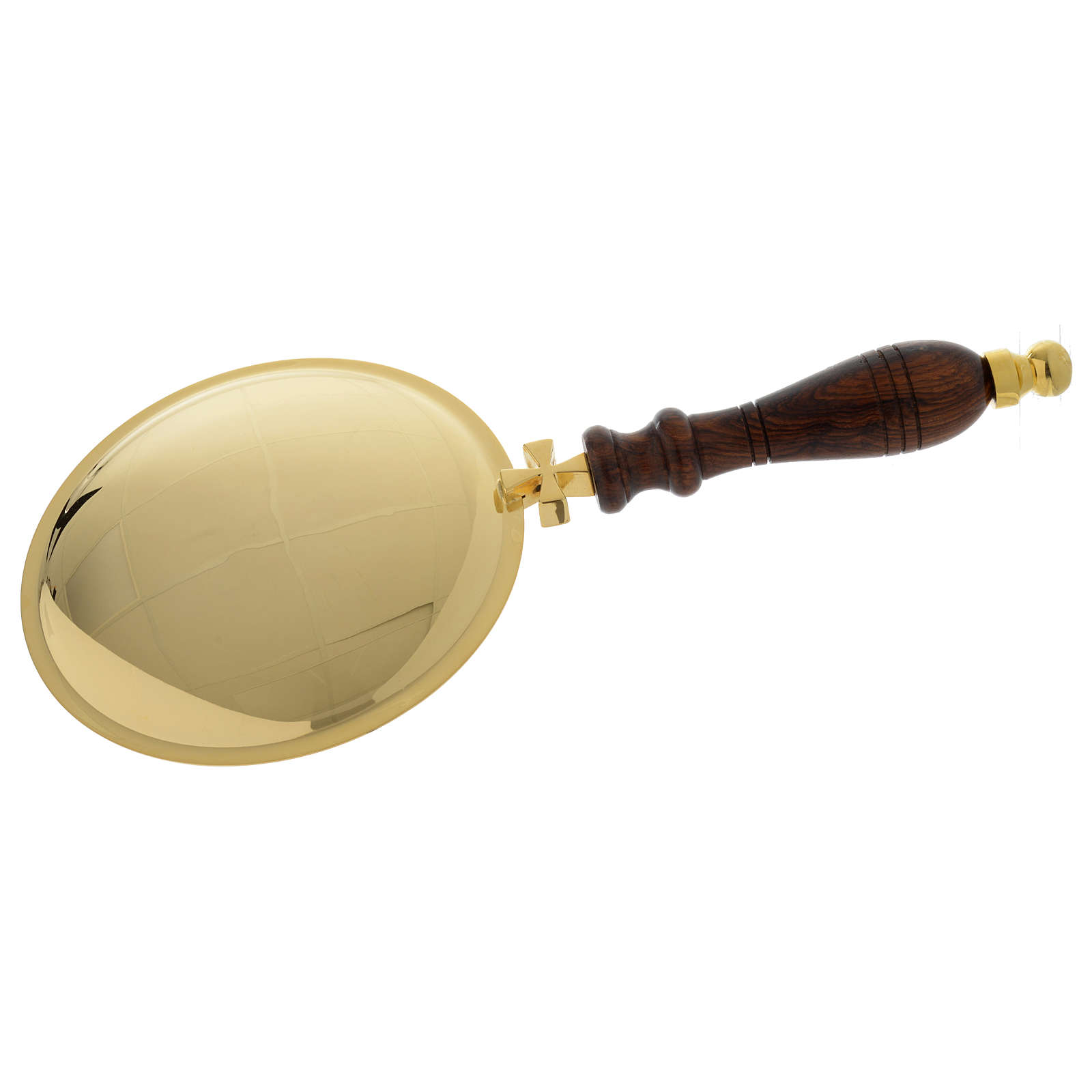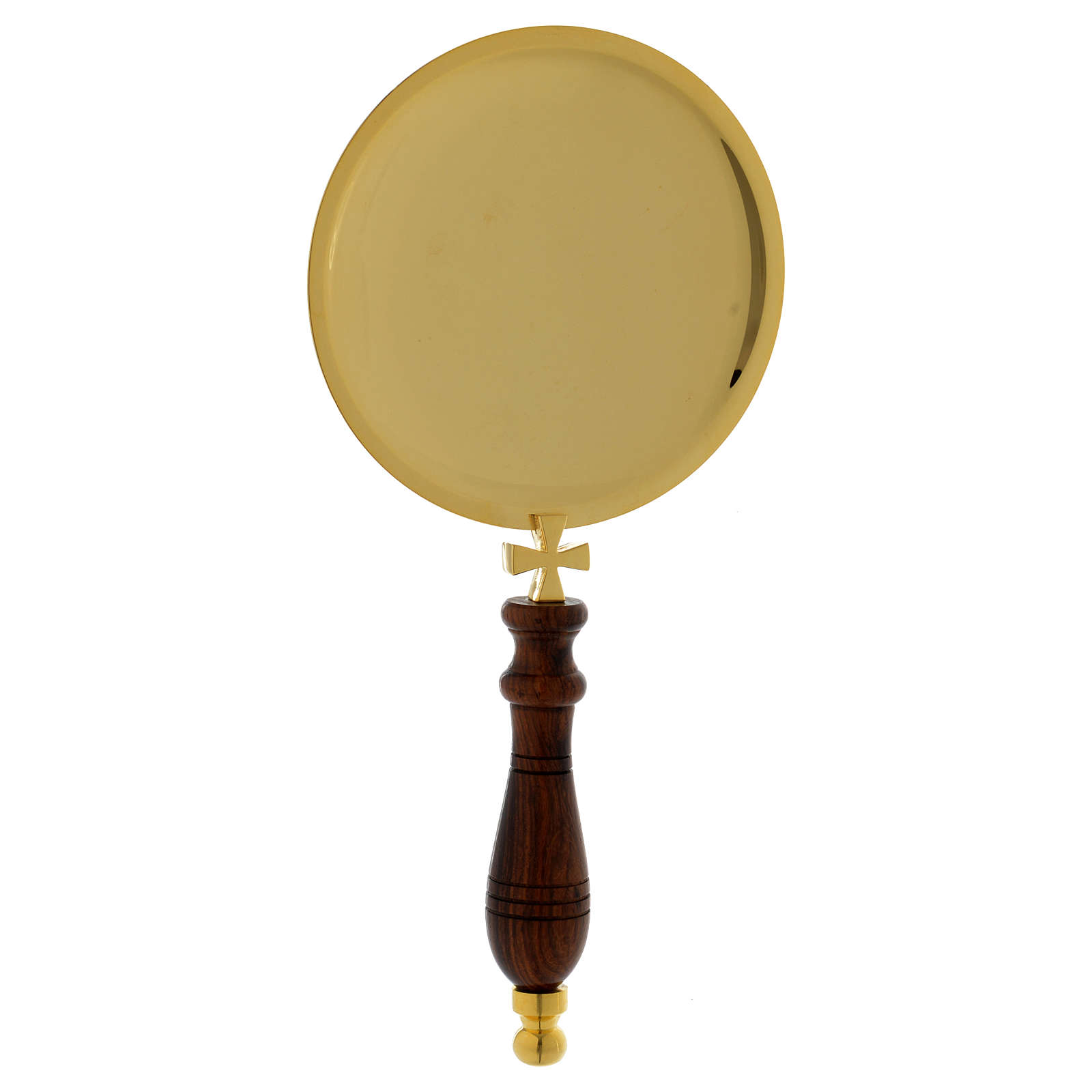 Plateau pour communion laiton doré manche bois. Plateau de communion de 31 cm de circonférence et 32 cm de longueur en laiton doré avec manche en bois.