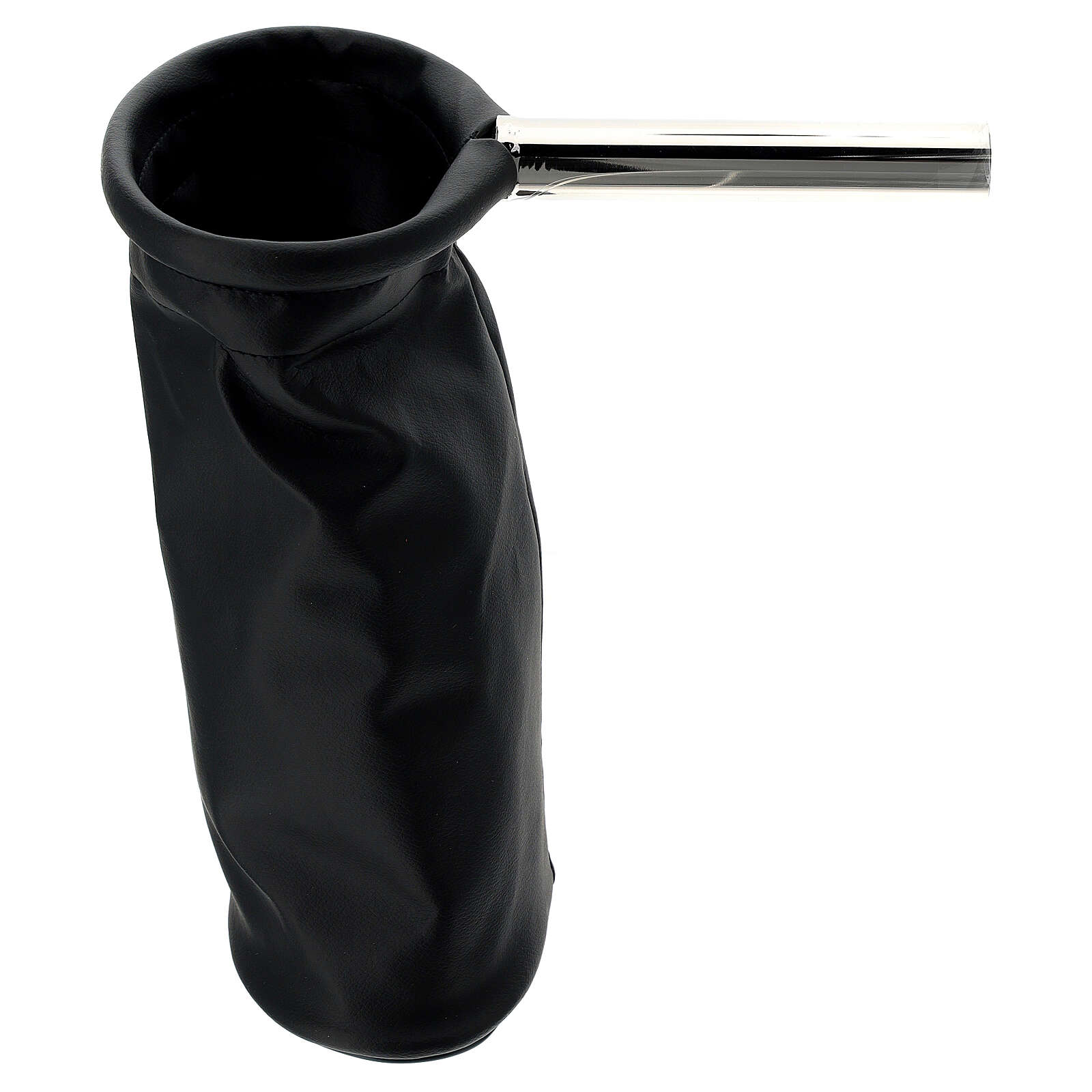 Sac aumône avec fermeture et manche. Le sac est en tissu sky noir avec une ouverture sur la partie supérieure qui empêche à l'argent de sortir. support pour manche en bois (diamètre interne du manche 2,3 cm)