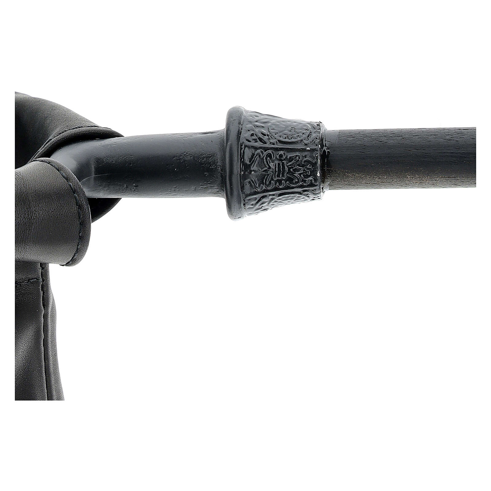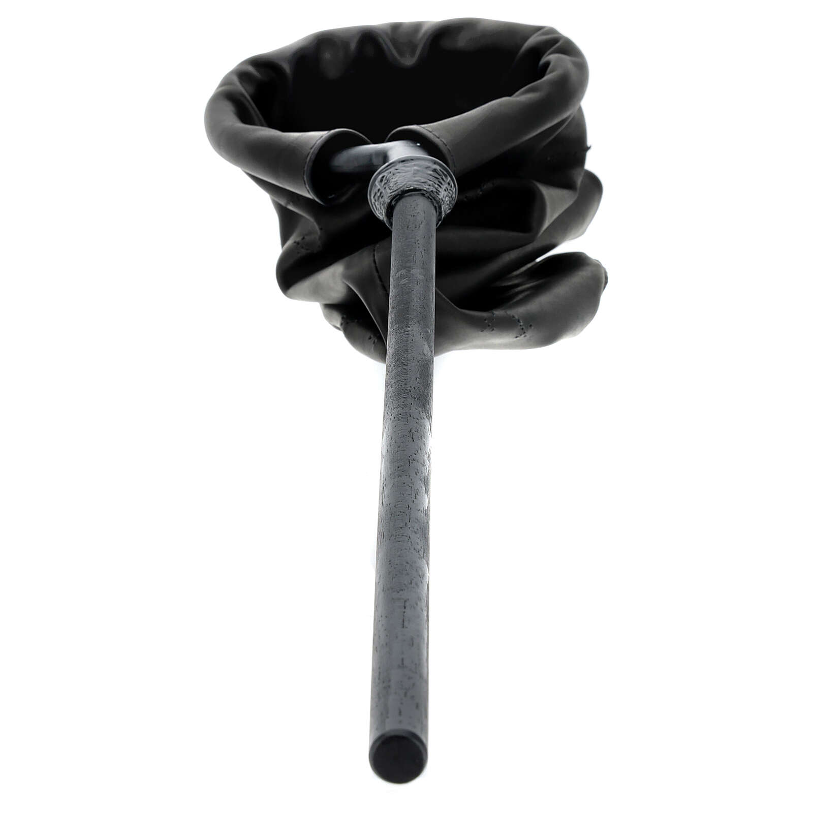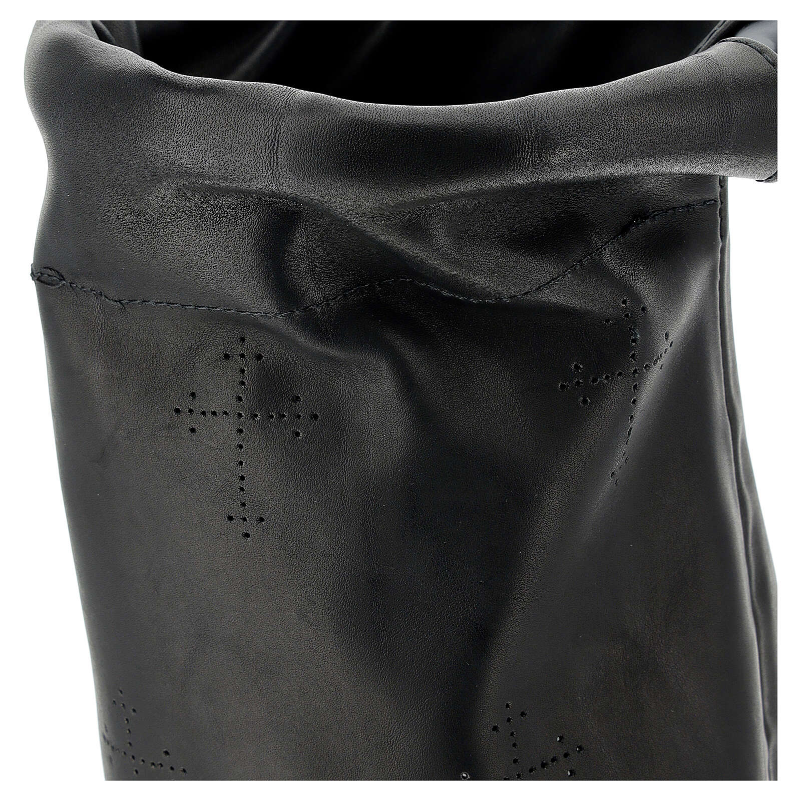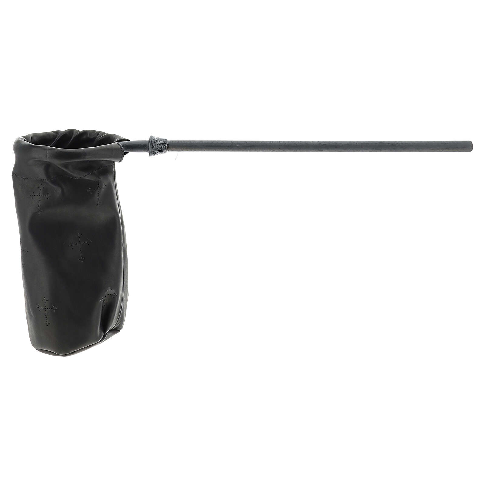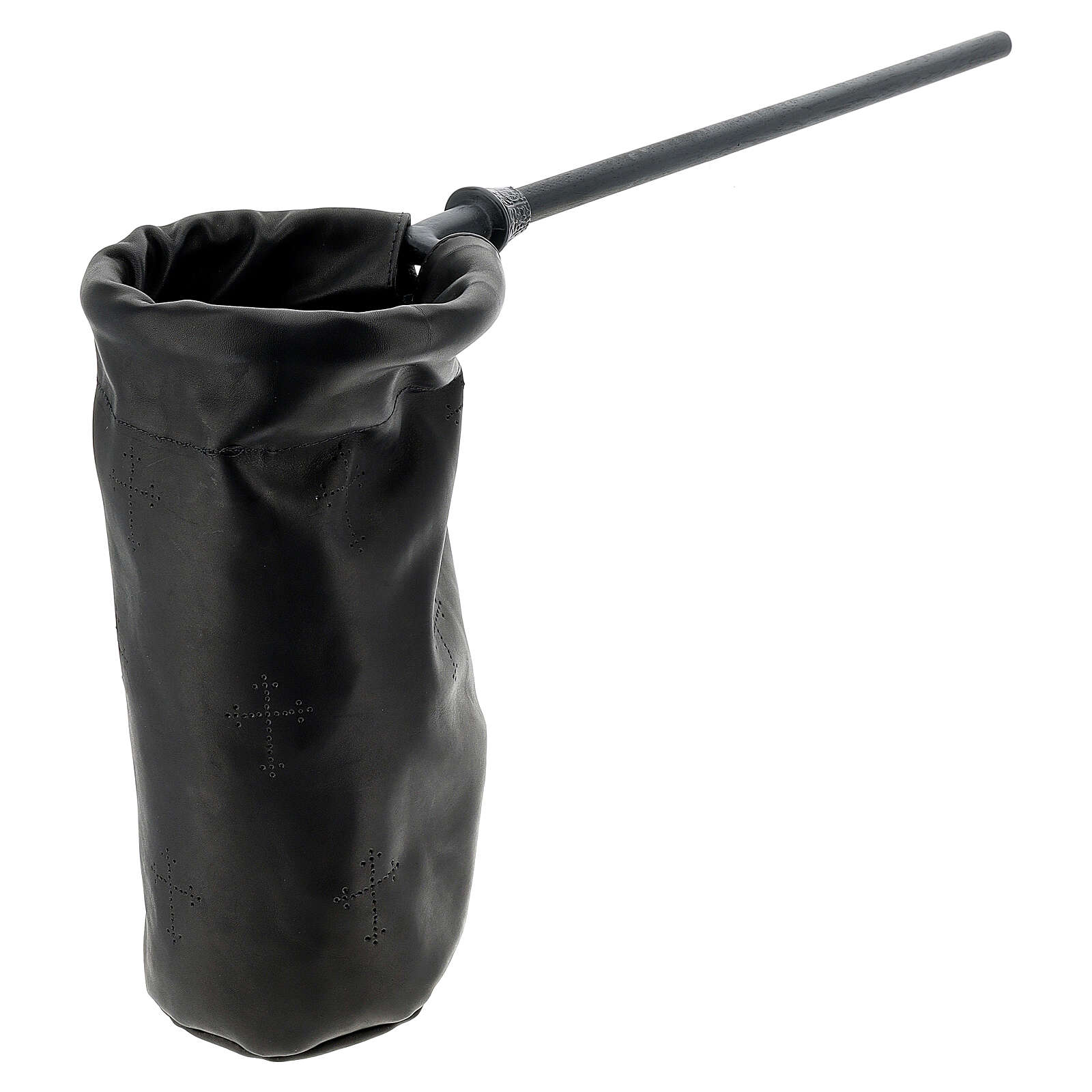 Sac pour aumône en cuir noir. Sac cylindrique pour offrandes de 14 cm de diamètre, réalisé en cuir noir avec manche en métal de 40 cm et détails ajourés en forme de croix.