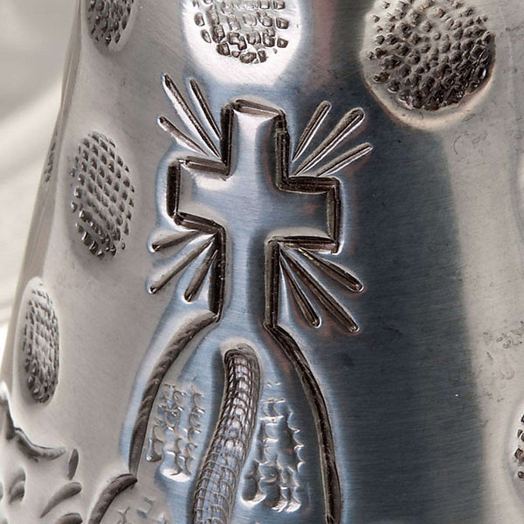 Set carafe et deux assiettes pour effectuer le lavage des mains avant la célébration de la liturgie eucharistique. Le set se compose d'une carafe et deux assiettes : une assiette creuse dans laquelle on peut verser de l'eau et l'autre assiette sur laquelle on peut poser la carafe après utilisation. Les articles sont en laiton argenté. Le décor en relief donne élégance à l'article. Le set est réalisé de manière artisanale dans une entreprise italienne avec une expérience dans le domaine de 51 ans.