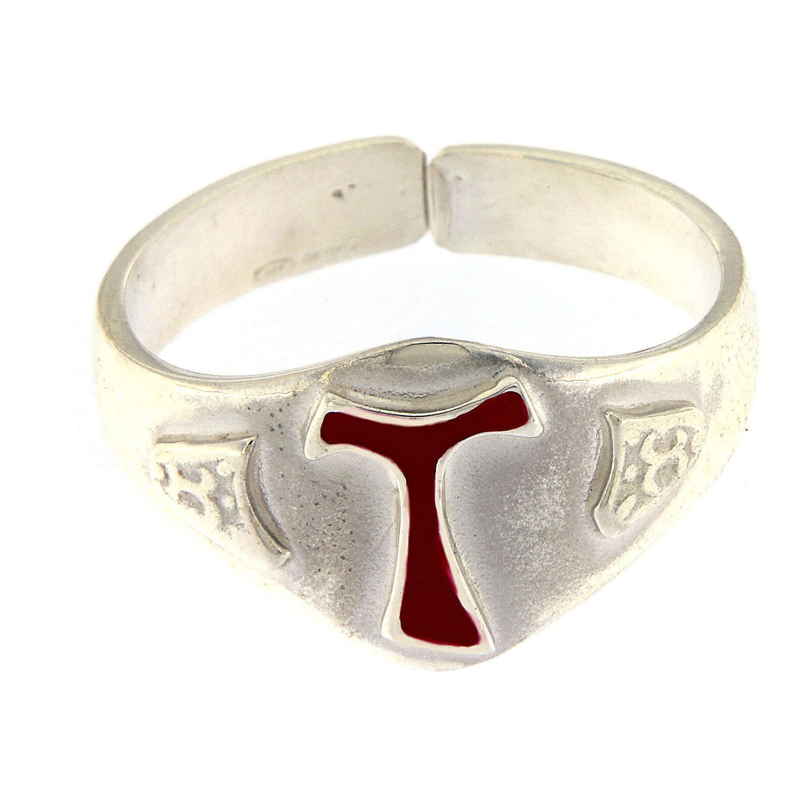 Anneau épiscopal en argent 925 avec tau émaillé. Anneau pour évêque réalisé de manière artisanale en Italie par des artisans avec une longue expérience et compétents dans le travail de l'argent pour garantir un produit d'haute qualité. Anneau réglable.