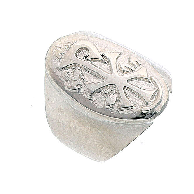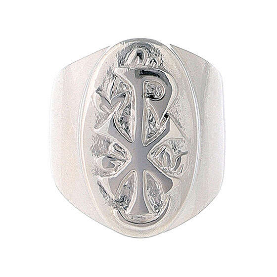 Anneau épiscopal en argent 925 avec le symbole Chi-Rho. Bague précieuse avec poinçonnage interne à garantie de la qualité du matériel et facilement réglable.
