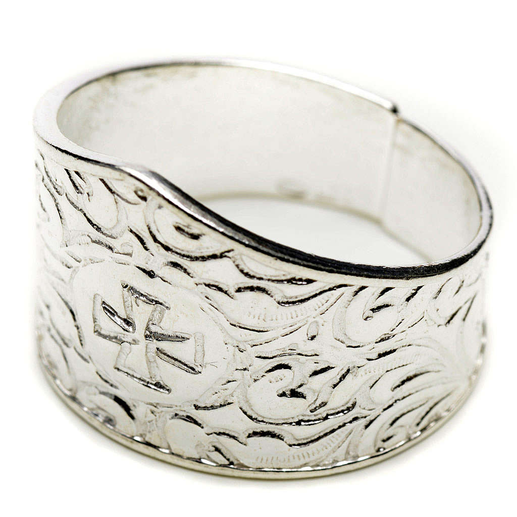 Bague pour évêque en argent 925 décorée avec une croix. Anneau épiscopale réalisé de manière artisanale en Italie. Anneau réglable.