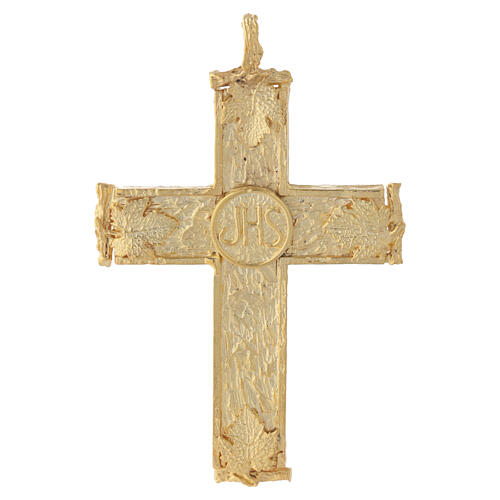 Croix pectorale en laiton plaqué or 18 kt, entièrement réalisée à la main par les artisans de Pical Arte selon la technique de la cire perdue, avec finitions soignées. Le modèle présente des feuilles appliquées aux extrémités des bras et un médaillon central avec l'inscription JHS en relief. Dimensions : 11,5x7,5 cm ; épaisseur 4 mm.