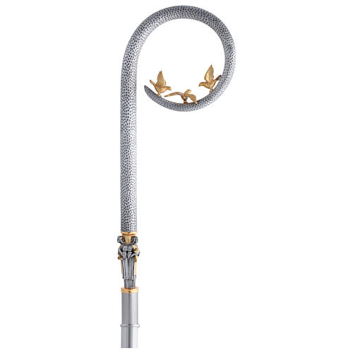 Crosse en laiton avec tiges amovibles, caractérisé par une volute argentée ornée de trois colombes dorées.