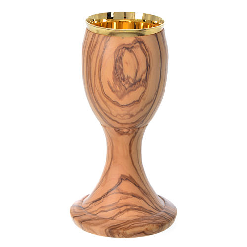 Calice en olivier vieilli d'Assise h 16 cm. Calice en bois d'olivier entièrement réalisé à la main par un artisan d'Assise à partir d'un seul morceau de bois. Chaque pièce est unique. En partant d'un modèle de base, la courbe de chaque coupe est adaptée pour en rendre la prise en main pratique et harmonieuse. La coupe en laiton doré est fixée au pied avec une vis traversante.