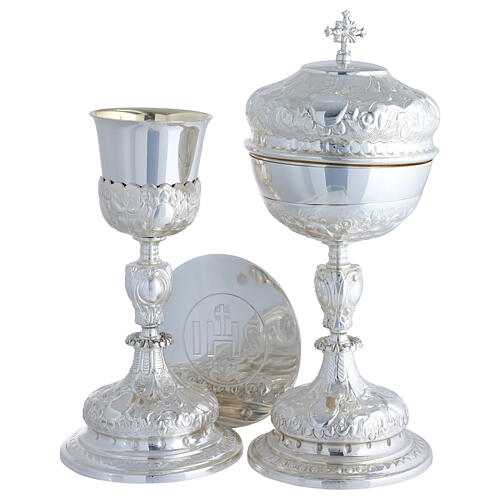 Set de calice avec patène et ciboire assortis en laiton avec bain d'argent et coupe intérieure argentée. Calice et ciboire présentent une décoration baroque assortie de motifs floraux, de branches et de feuilles, ainsi qu'un nœud ovale. Le calice est accompagné d'une patène avec gravure IHS dorée de 14 cm de diamètre.