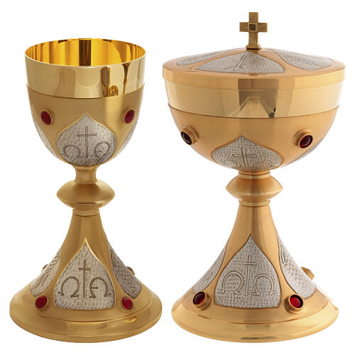 Calice Ciboire Patènes ciselés avec pierres. Ensemble d'articles eucharistiques ciselés, orné de pierres en résine et composé d'un calice, d'un ciboire, d'une patène creuse avec couvercle et d'une patène eucharistique sans couvercle.