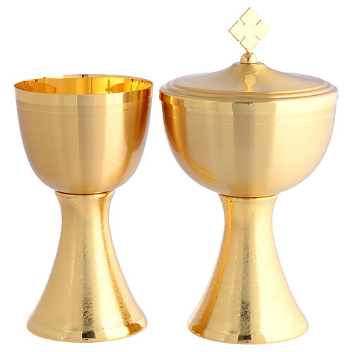 Set de calice et ciboire réalisés en laiton doré, dont le ciboire est orné d'un délicat couvercle avec poignée en forme de croix.