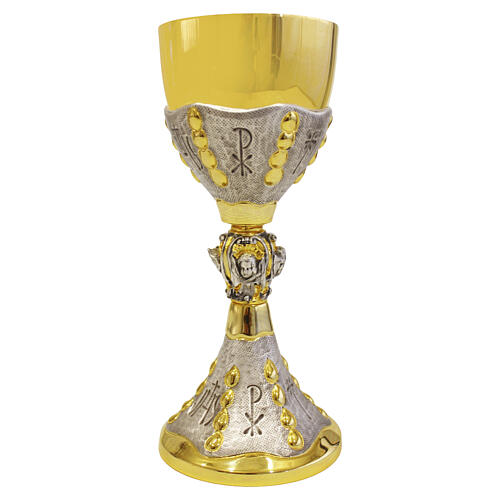 Calice et ciboire réalisés en laiton avec double finition : bain d'or 24 carats et bain d'argent, travaillés avec un effet satiné sablé. Ciselés des symboles liturgiques JHS, Chi-Rho et croix, et ornés de motifs en goutte sur la coupe et la base. Le nœud du calice, réalisé par fusion artistique, apporte un détail central raffiné.