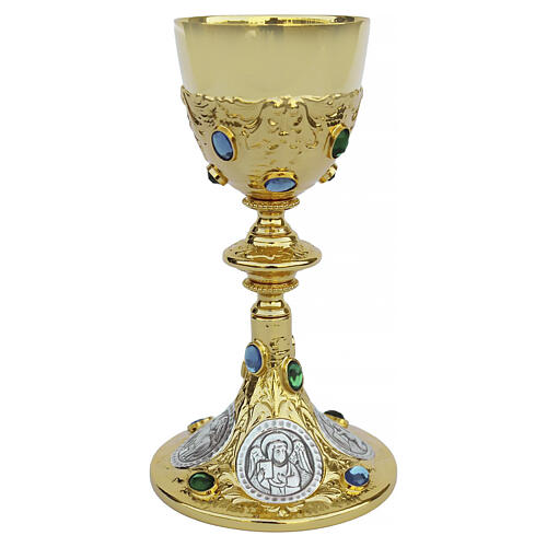 Splendide calice liturgique avec base travaillée en fonte artistique réalisée à la cire perdue, rehaussé de détails en or et argent vieilli. Décoré de pierres rouges ovales serties, cet article liturgique présente des figures d'anges sculptées sur la coupe et une représentation de la Vierge sur le nœud central.