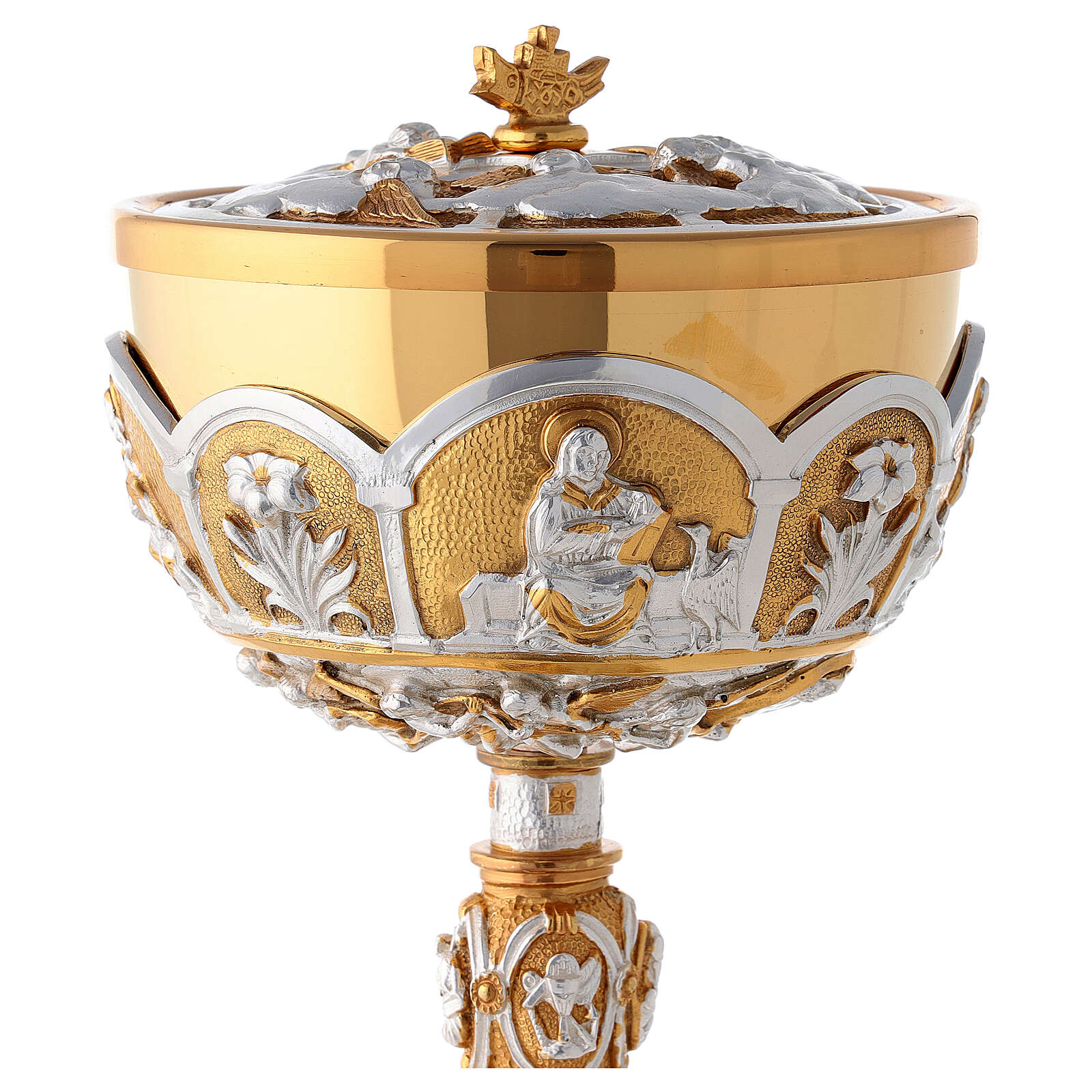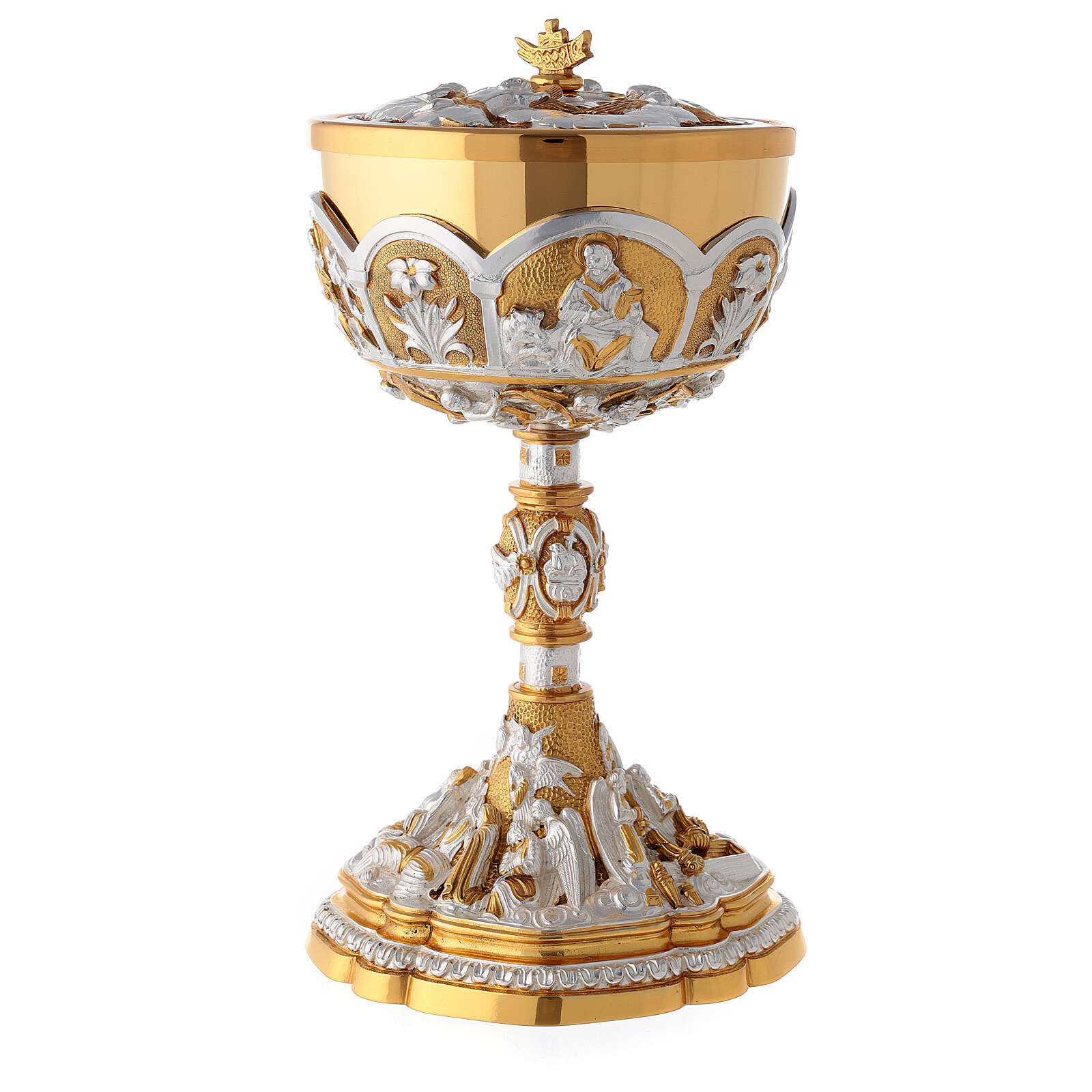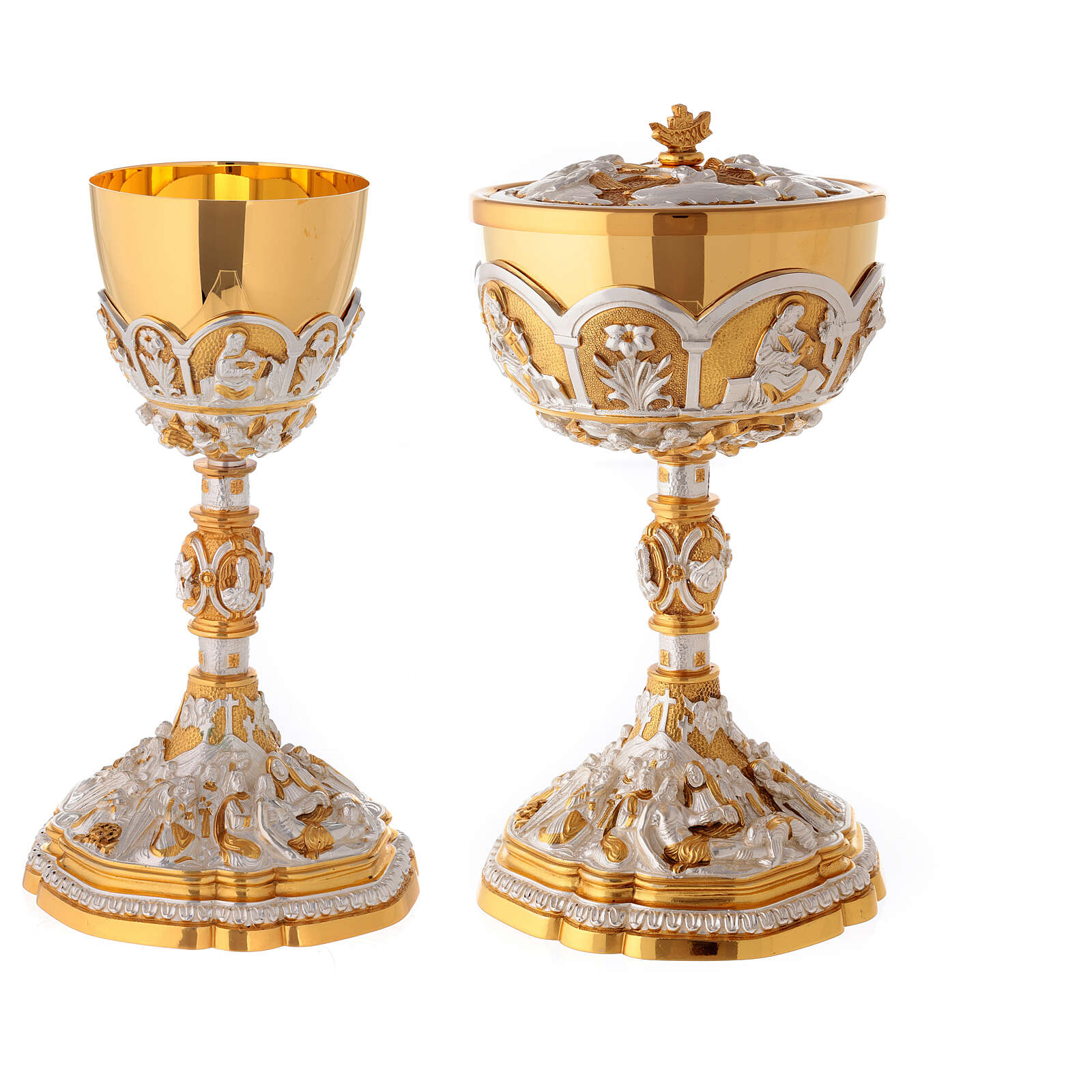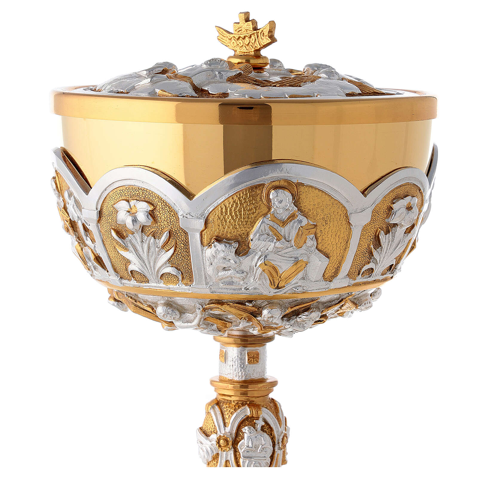 Calice et ciboire en laiton doré et décors en argent qui reproduisent la déposition du Christ de la croix sur la base et les évangélistes sur le couvercle.