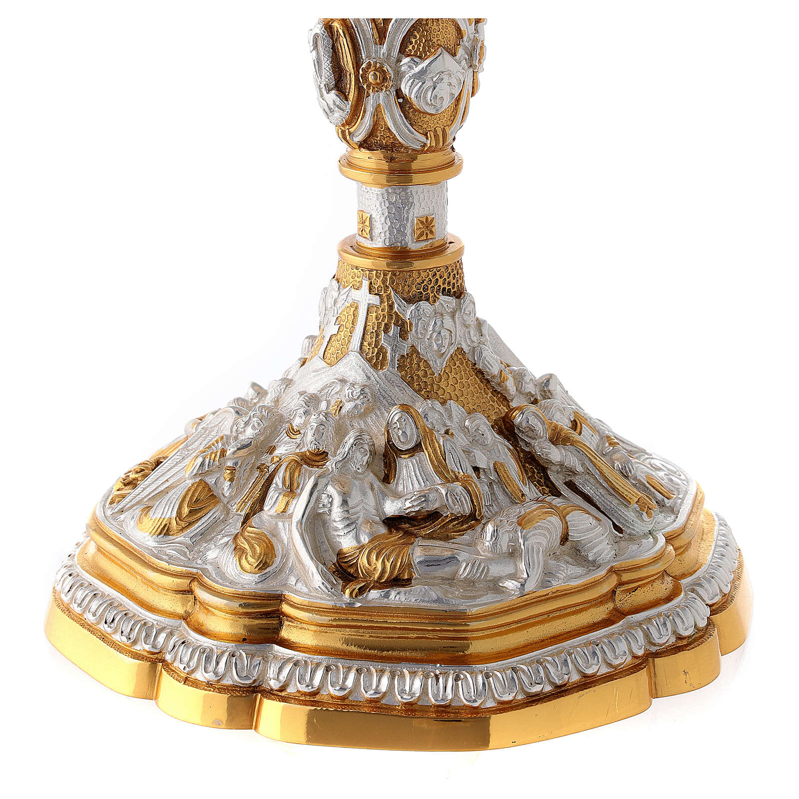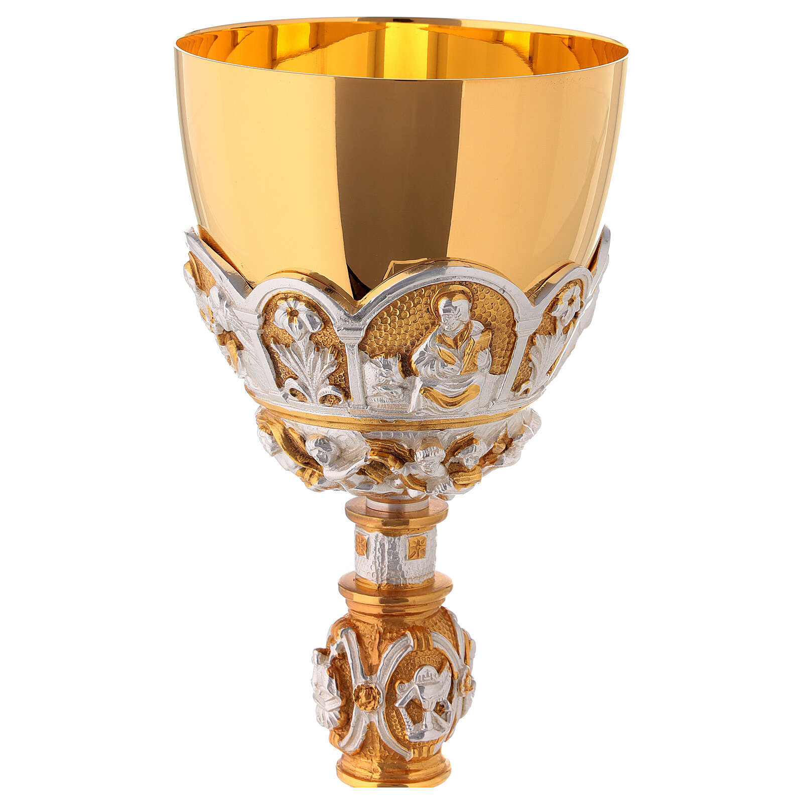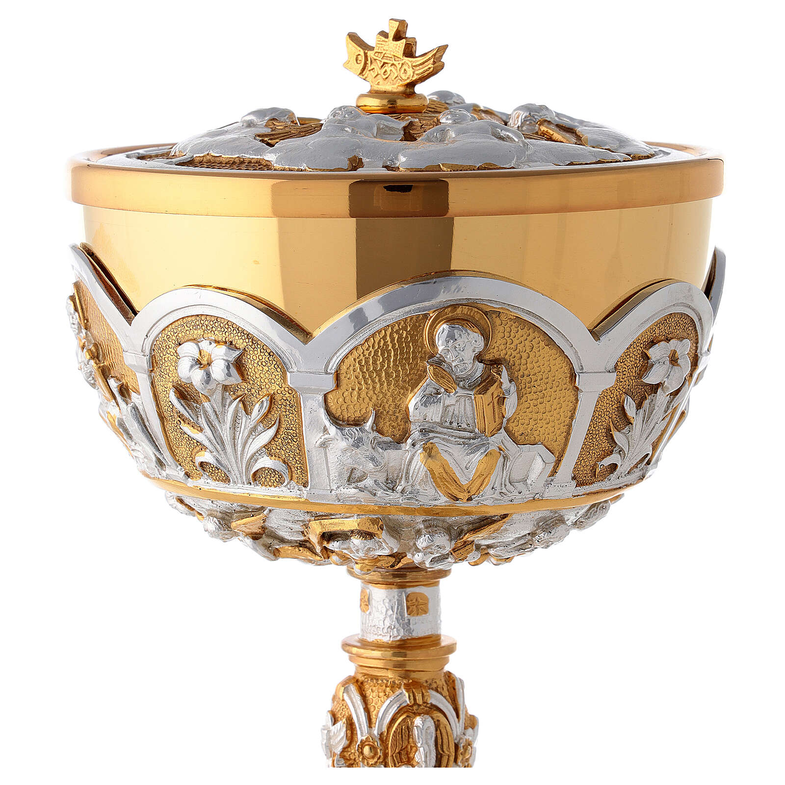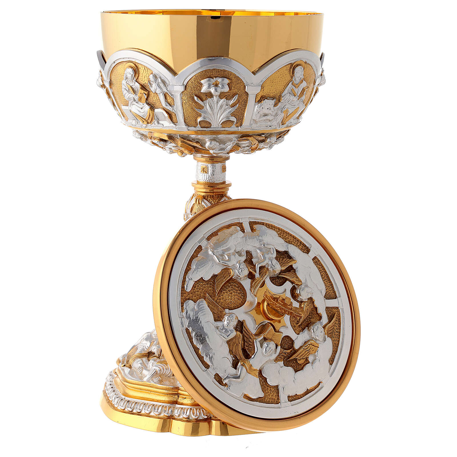 Calice et ciboire en laiton doré et décors en argent qui reproduisent la déposition du Christ de la croix sur la base et les évangélistes sur le couvercle.