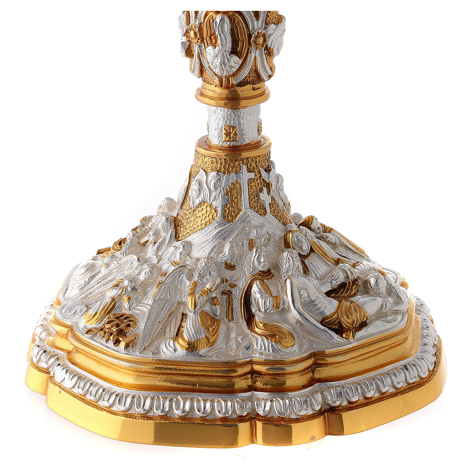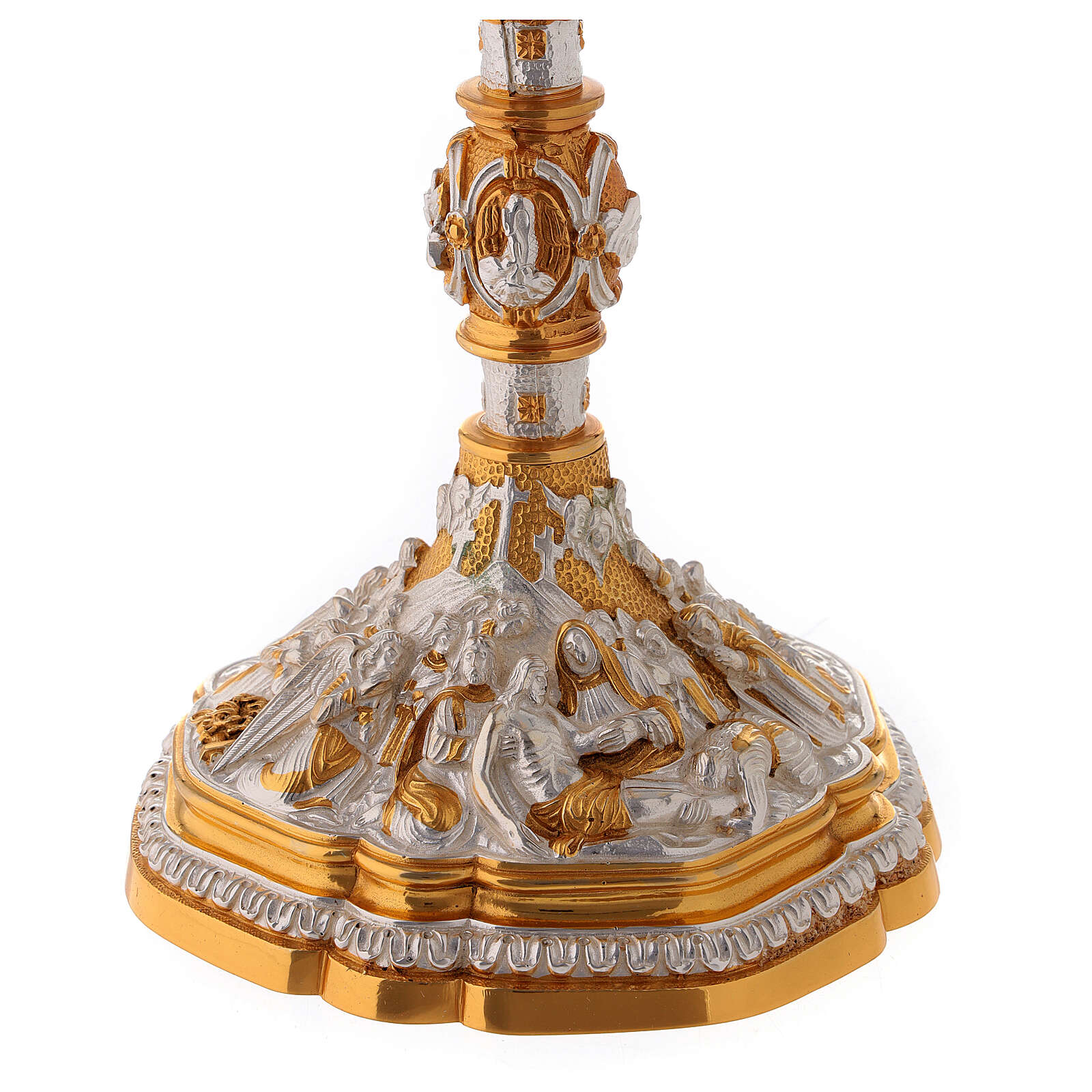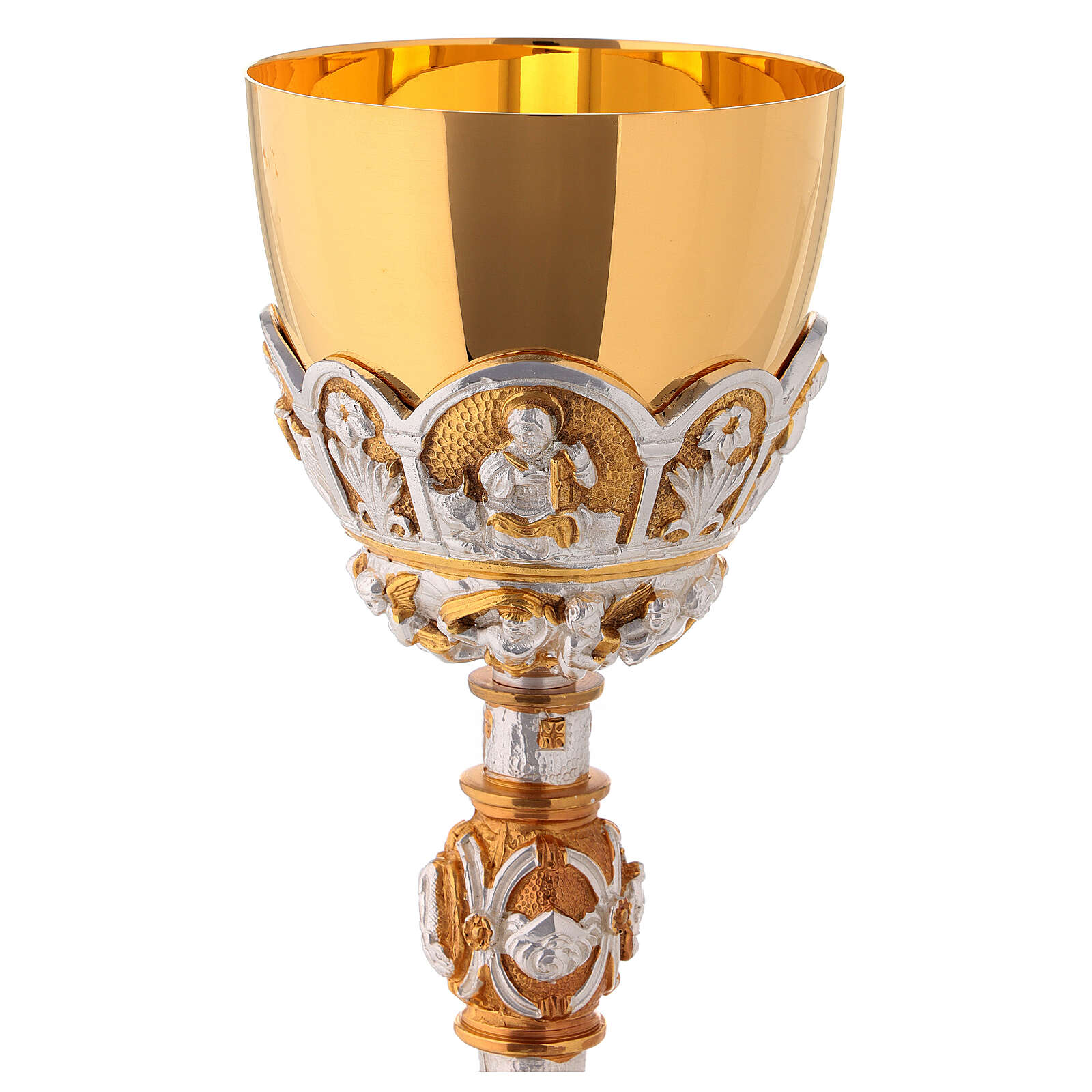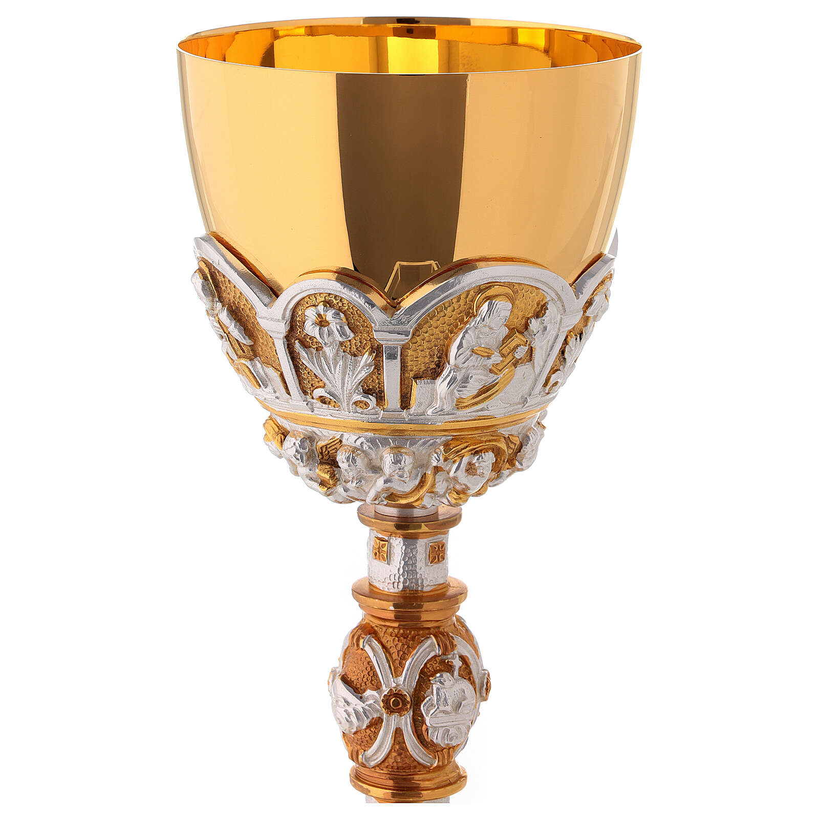 Calice et ciboire en laiton doré et décors en argent qui reproduisent la déposition du Christ de la croix sur la base et les évangélistes sur le couvercle.
