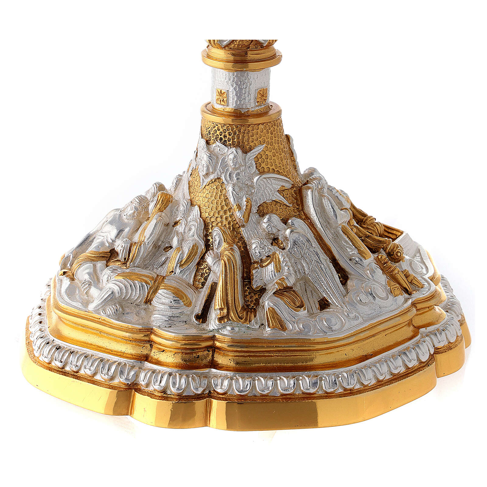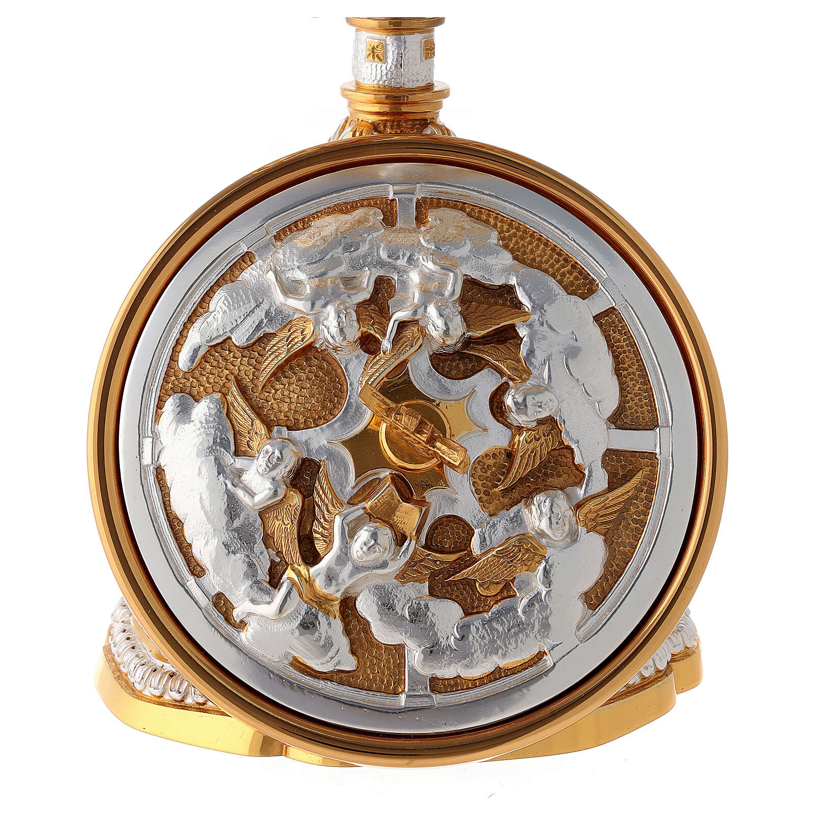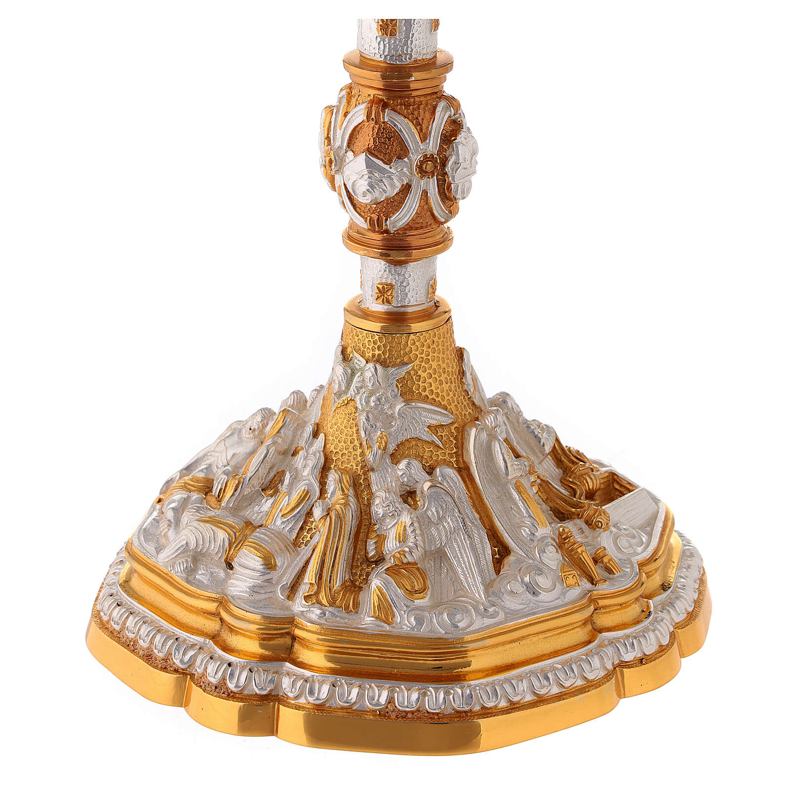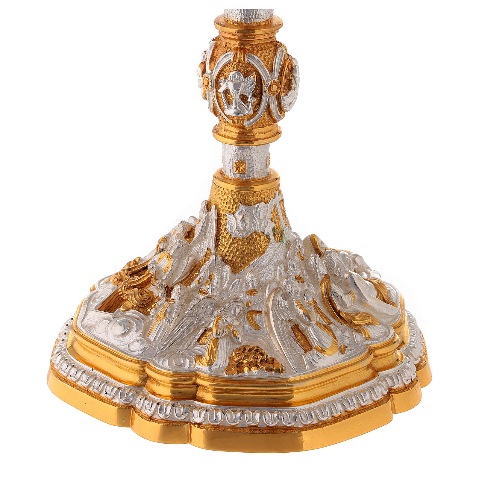 Calice et ciboire en laiton doré et décors en argent qui reproduisent la déposition du Christ de la croix sur la base et les évangélistes sur le couvercle.