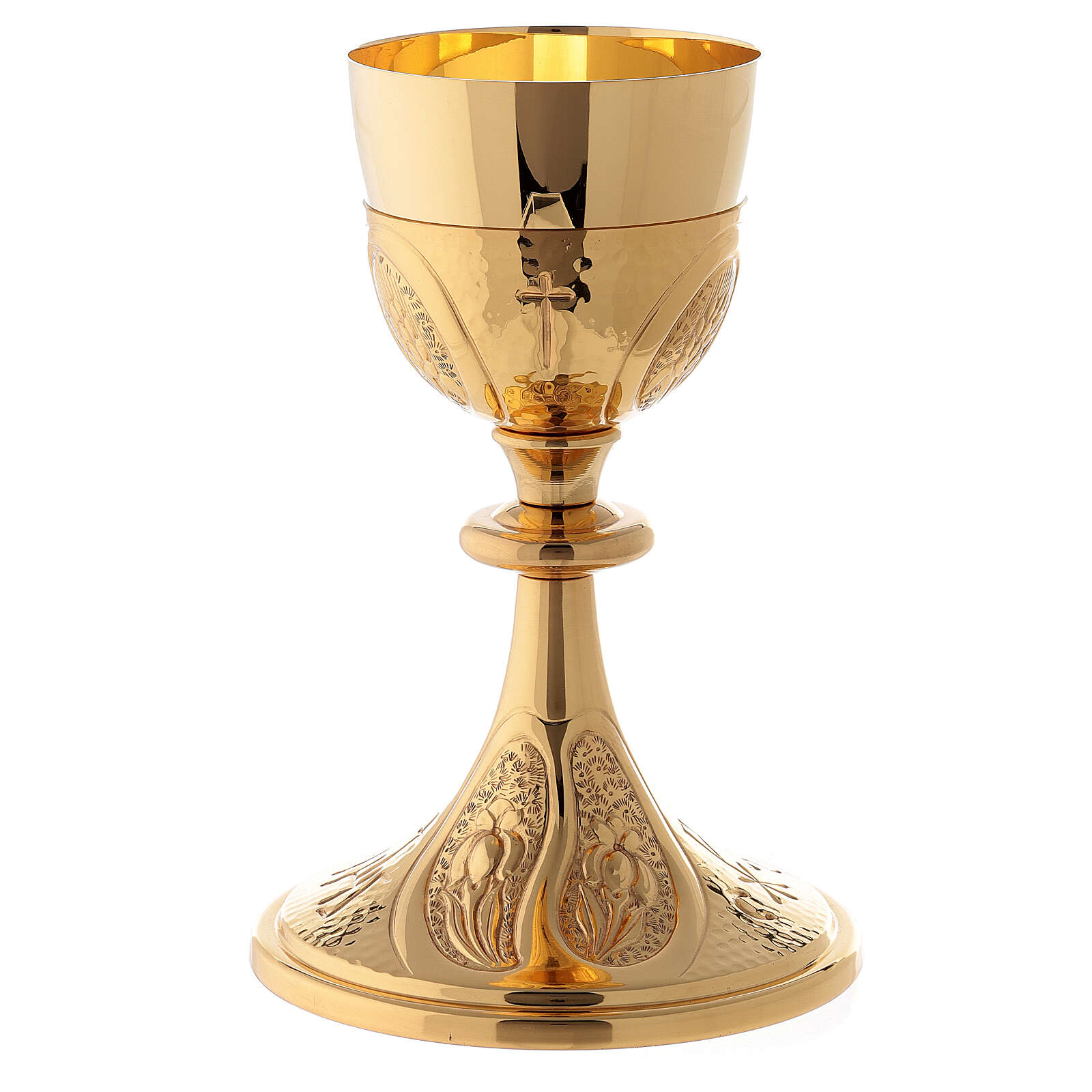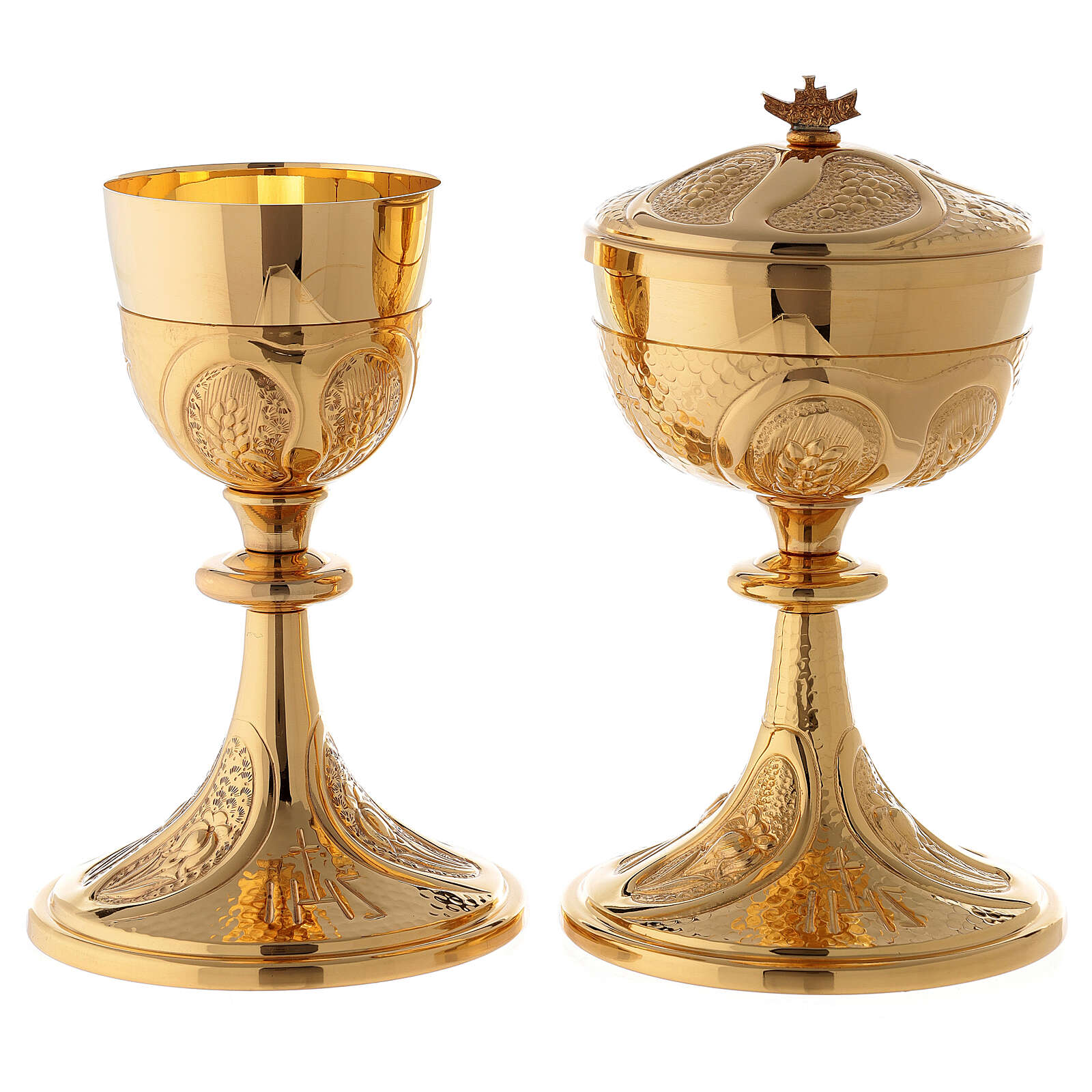 Le calice et le ciboire sont en laiton doré et satiné, sur la base il y a une croix rouge avec profil doré. Le ciboire contient 150 hosties. Le calice et le ciboire sont réalisés de manière artisanale dans une entreprise italienne avec une longue expérience. Les décors originaux et les matériaux utilisés rendent le produit unique et précieux.