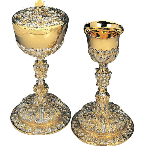 Calice laiton doré argent 925/00 anges. Réalisation en laiton doré et argent ciselé et martelé. diamètre du ciboire de 16 cm. patène réalisée dans une petite entreprise italienne avec une forte expérience dans le métal et les objets sacrés. Tous les matériaux utilisés sont de provenance italienne.
