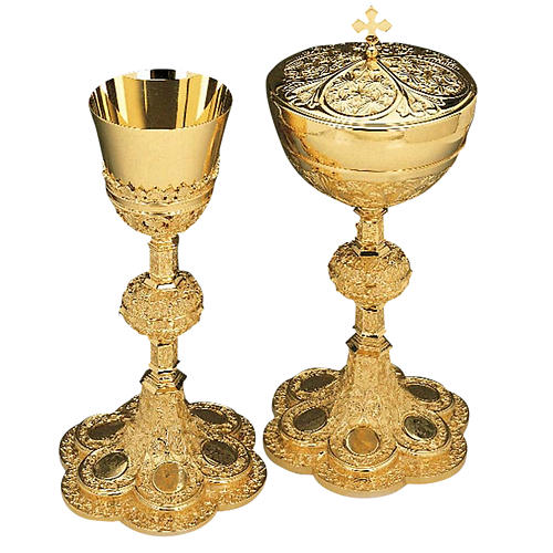 Calice laiton doré argent 925/00 décors médaille. Réalisation en laiton doré et argent ciselé et martelé. diamètre du ciboire de 16 cm. patène réalisée dans une petite entreprise italienne avec une forte expérience dans le métal et les objets sacrés. Tous les matériaux utilisés sont de provenance italienne.