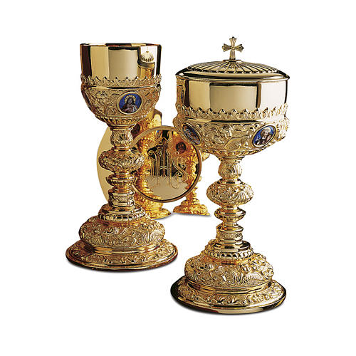 Calice patène et ciboire Molina baroque Sainte Famille coupe argent 925 doré. Calice, patène et ciboire Molina en style baroque, réalisés avec coupe en argent 925 doré et décorés par un fin travail de ciseau en bas-relief.