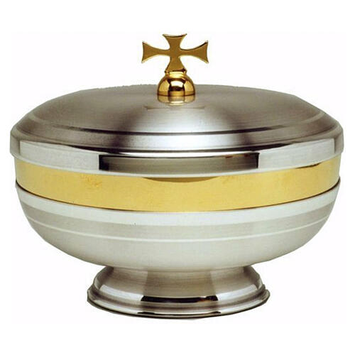 Ce ciboire est fabriqué par une entreprise italienne spécialisée dans la production d'articles liturgiques métalliques. Ce modèle est réalisé en laiton argenté à l'extérieur avec un intérieur en laiton doré, adapté au contact des hosties. La fausse-coupe présente une finition satinée, tandis que la coupe est soulignée par une ligne centrale en laiton argenté lisse. Le rebord supérieur est en laiton doré lisse, créant un contraste visuel entre les surfaces. Le couvercle reprend les mêmes finitions et est surmonté d'une croix moderne dorée au design épuré.