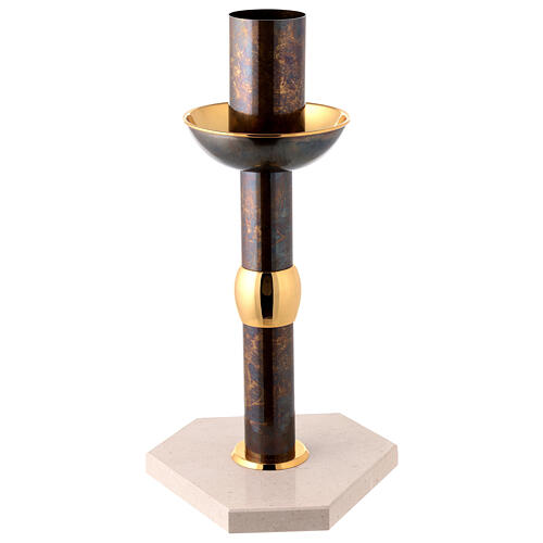Base pour cierge en laiton et bronze satiné, lucide en style moderne. La base est en marbre rouge de Vérone. Du même style vous pouvez trouver aussi les chandeliers, les bases pour cierge, les croix murales et les lampes de table. Ce produit est réalisé dans une entreprise qui connait le secteur liturgique depuis des années. Les dessins sont originaux et la qualité des matériaux est très connue.