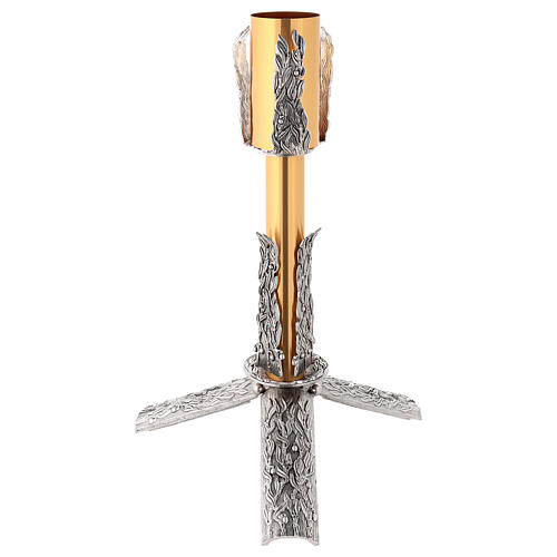 Base pour cierge en bronze doré et argenté. La base est décorée avec des feuilles sur les quatre côtés. Du même style vous trouvez aussi les candélabres, la base pour cierge, les croix murales et les lampes pour autel. Cet article est produit dans une entreprise italienne avec grande expérience dans le secteur.