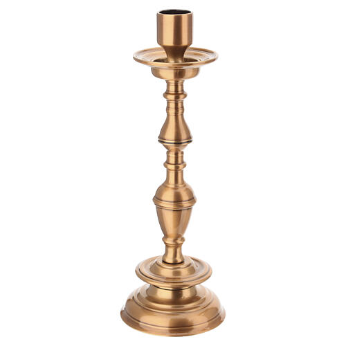 La structure présente une base circulaire, un fût central rythmé de moulures symétriques et un logement supérieur prévu pour l’accueil de bougies de 2 cm de diamètre, avec un traitement de surface uniforme couleur bronze.
