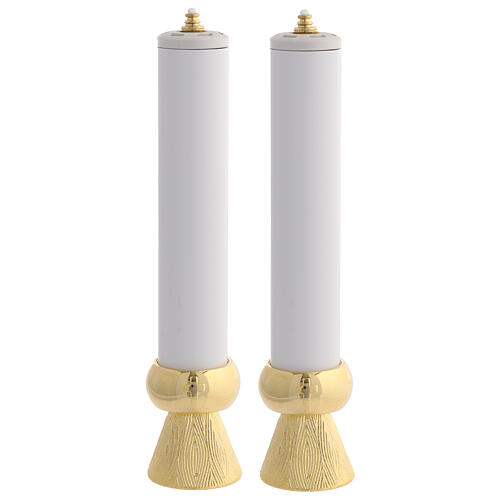 Ces bougeoirs d'autel sont accompagnés de bougies LED assorties, comme illustré en photo.