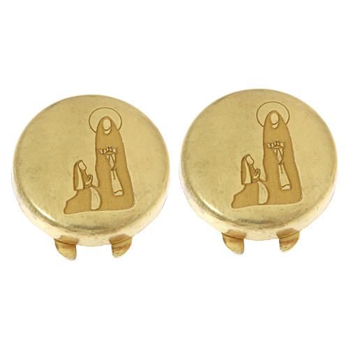 Paire de cache-boutons dorés en argent 925, finement gravés représentant Notre-Dame de Lourdes et, à ses pieds, Sainte Bernadette en prière.