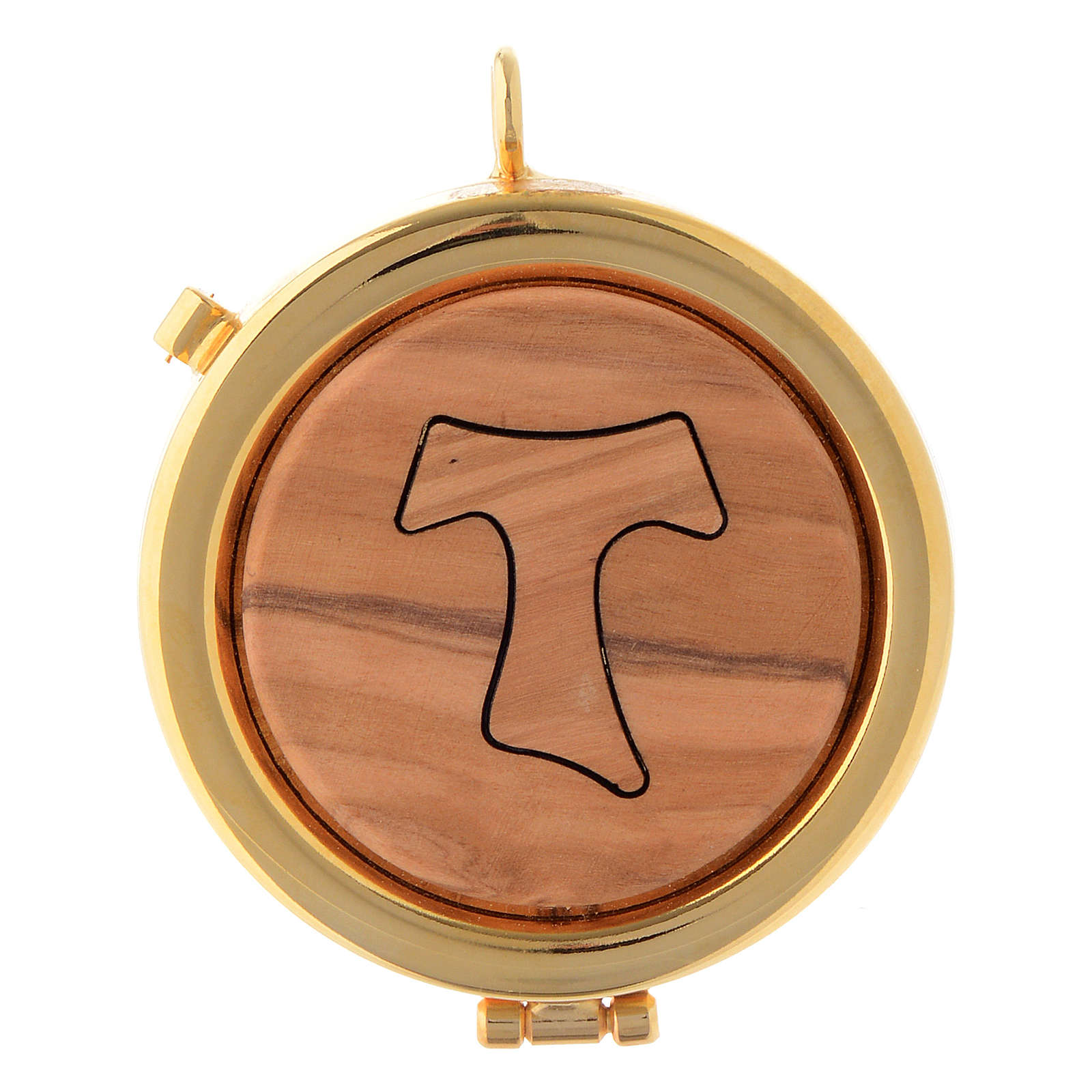 Custode eucharistique olivier Tau 6 cm. Custode à hostie de 6 cm de diamètre, réalisée en laiton avec bain d'or et décorée d'une plaque en olivier d'Assise et image de croix Tau.