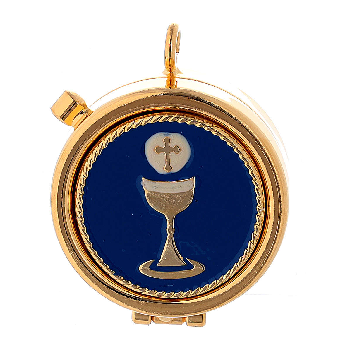 Custode hosties mini 4 cm plaque émaillée calice. Custode à hosties de 4 cm de diamètre pouvant contenir 4 hosties environ, réalisée en Italie en laiton avec dorure 24K et plaque émaillée décorée de calice et hostie sur fond bleu.Modèle avec anneau pour pouvoir la suspendre au cou avec un cordon.