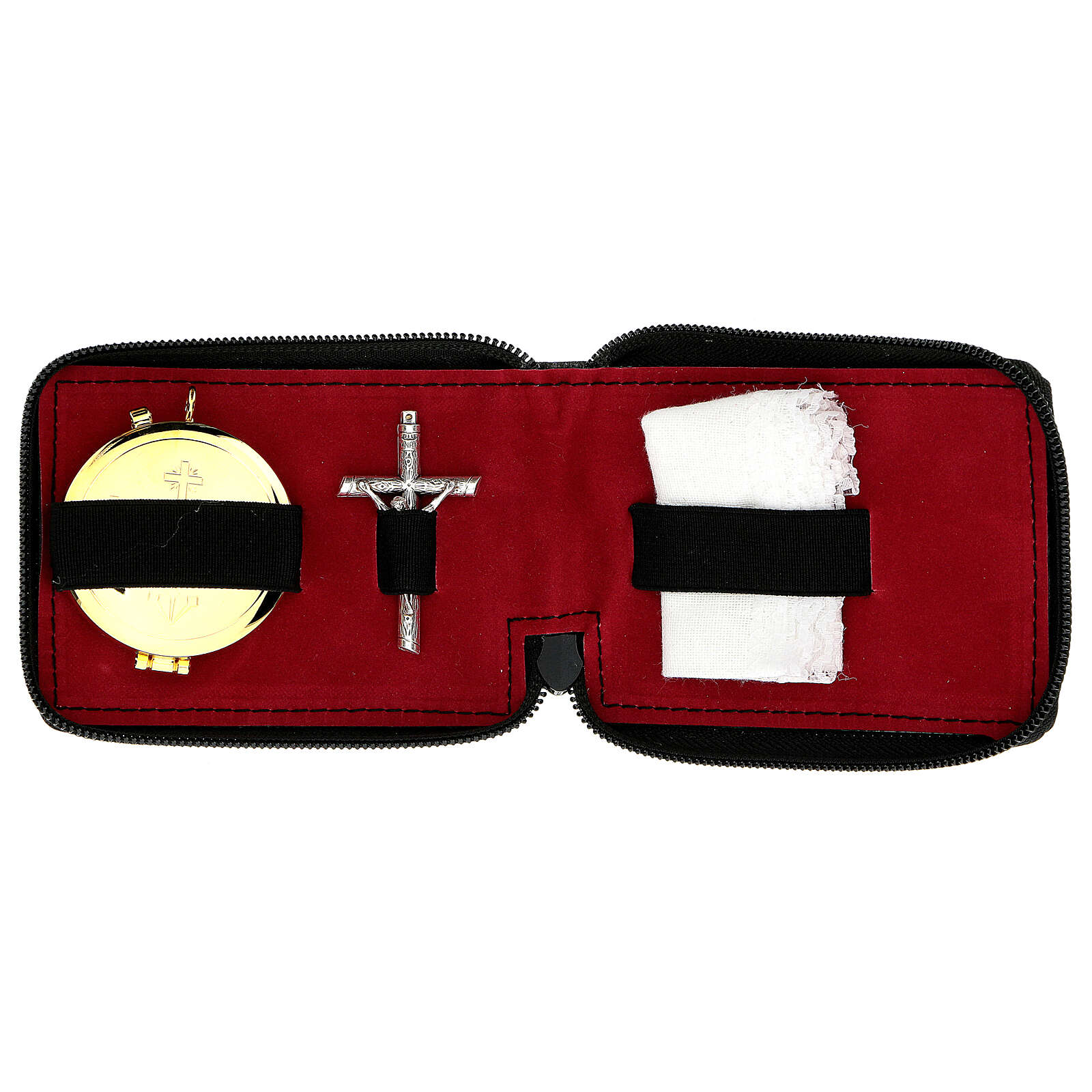 étui rigide en cuir pour custode, fermeture éclair. Custode à hostie en métal de 5 cm de diamètre, une petite croix et un purificatoire.