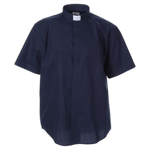 STOCK Chemise clergyman manches courtes popeline bleu. Chemise clergy manches courtes en coton popeline bleu, un tissu frais, légér et très résistant. Modèle à la coupe élégante et confortable, dotée d'une poche sur le côté gauche et de boutons cachés.