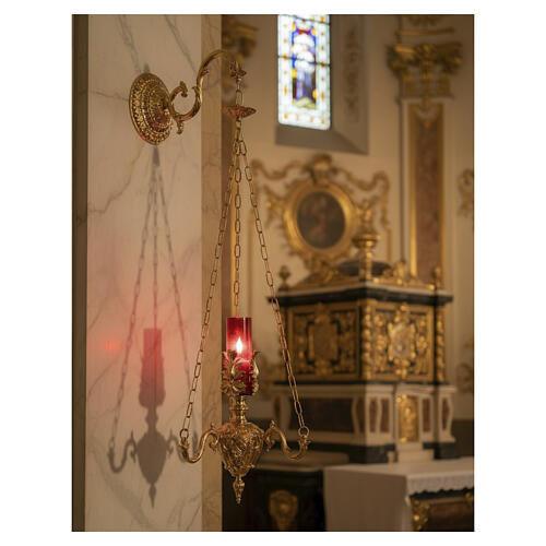 Lampadaire à suspendre style baroque laiton doré. Lampe à suspendre à deux bras reliés à des chaînes, réalisée en style baroque en laiton moulé doré par une entreprise artisanale italienne spécialisée dans le mobilier liturgique. Hauteur bras : 42 cm, hauteur chaîne : 80 cm, dimensions bras : 20x20x40 cm.