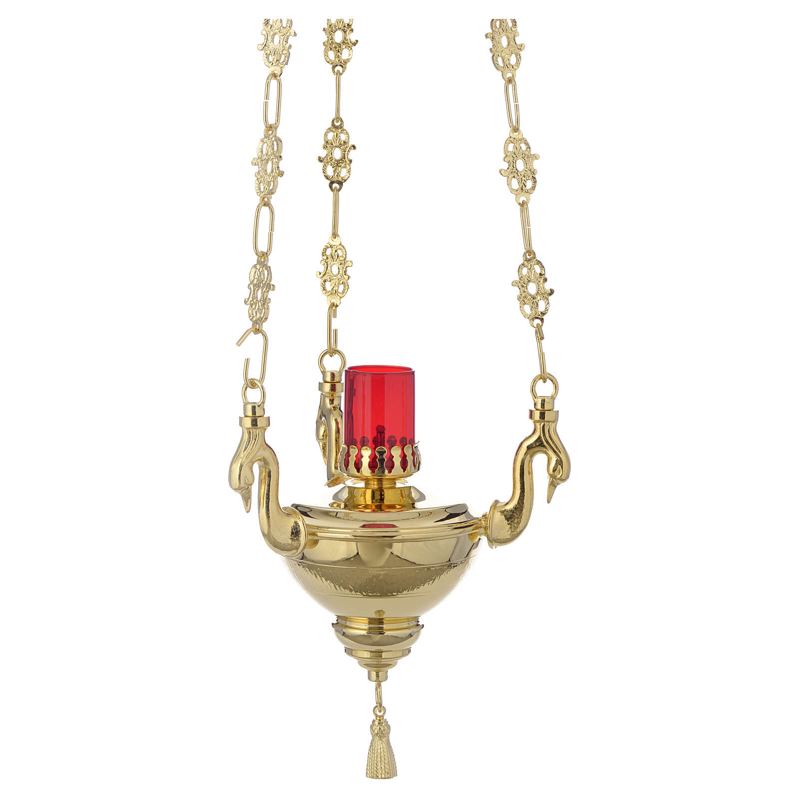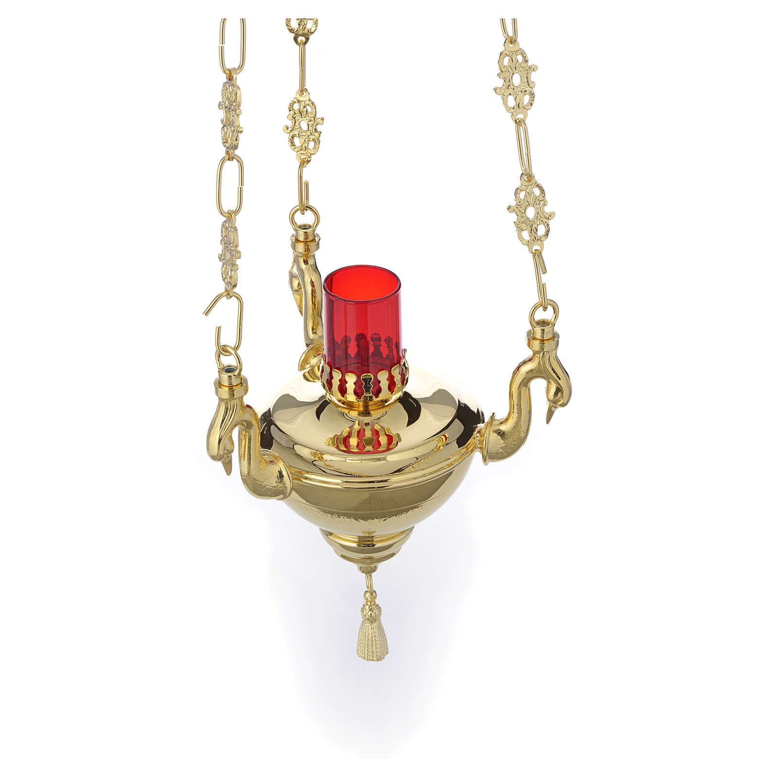 Lampe laiton doré cire liquide verre rouge. Lampe pour Sanctuaire en laiton doré avec verrine rouge.