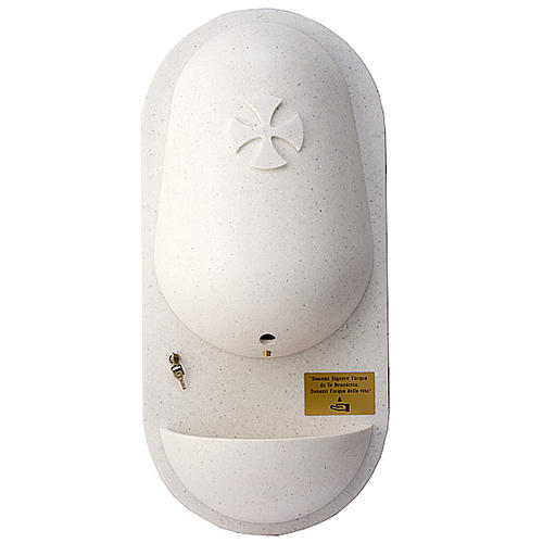 Bénitier en Hanex (résine, metil méthacrylique), fonctionnement électronique pour distribuer, selon demande, l'eau bénite. En approchant simplement le capteur, une quantité suffisante d'eau bénite est donnée pour le signe de croix.