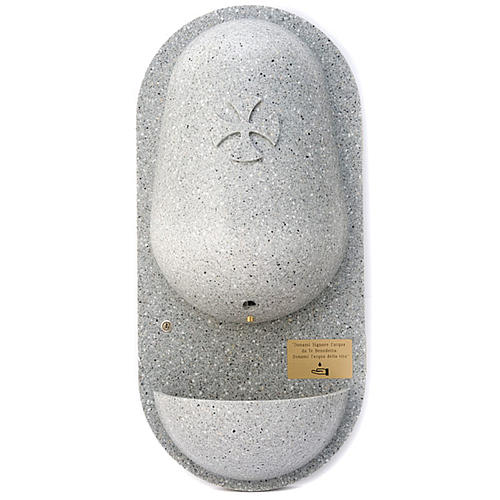Bénitier en Hanex (résine, metil méthacrylique), fonctionnement électronique pour distribuer, selon demande, l'eau bénite. En approchant simplement le capteur, une quantité suffisante d'eau bénite est donnée pour le signe de croix.