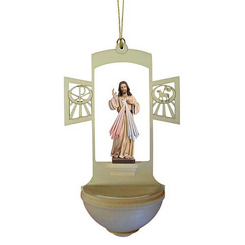 Bénitier Jésus miséricordieux bois entaillé. Bénitier réalisé en bois entaillé et insérée une statue de Jésus miséricordieux peinte. Bénitier gravé à la main par des artisans de la Val Gardena en Italie.