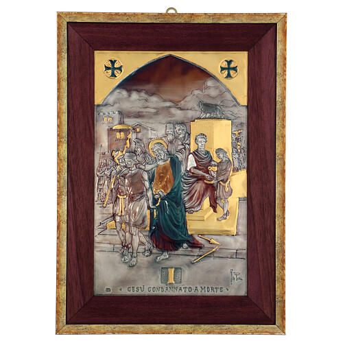 Chaque station est représentée sur un tableau avec base en bois recouverte d'une plaque de cuivre ciselé à la main, traité avec bain galvanique or et argent avec oxydation d'argent rouge et bleue et fini avec traitement antioxydant.