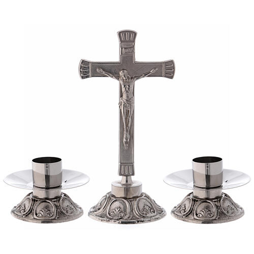 Cet set d'autel est réalisé en laiton nickelé et se distingue par son style baroque, riche en détails décoratifs qui confèrent élégance et raffinement à la table liturgique.
