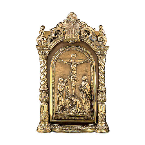 Tabernacle 50x30x30 cm style baroque avec scène de crucifixion en laiton doré Molina.