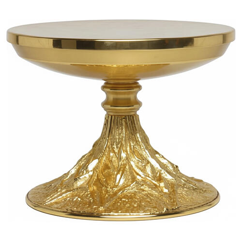 Base réalisée en laiton doré, conçue pour soutenir l'ostensoir avec stabilité et mettre en valeur le moment de l'exposition eucharistique. La partie inférieure est ornée d'un décor représentant des épis de blé, symbole rappelant le mystère eucharistique. Le trône présente un nœud central lisse reliant le pied au plateau supérieur et reprenant le style épuré du plan d'appui.