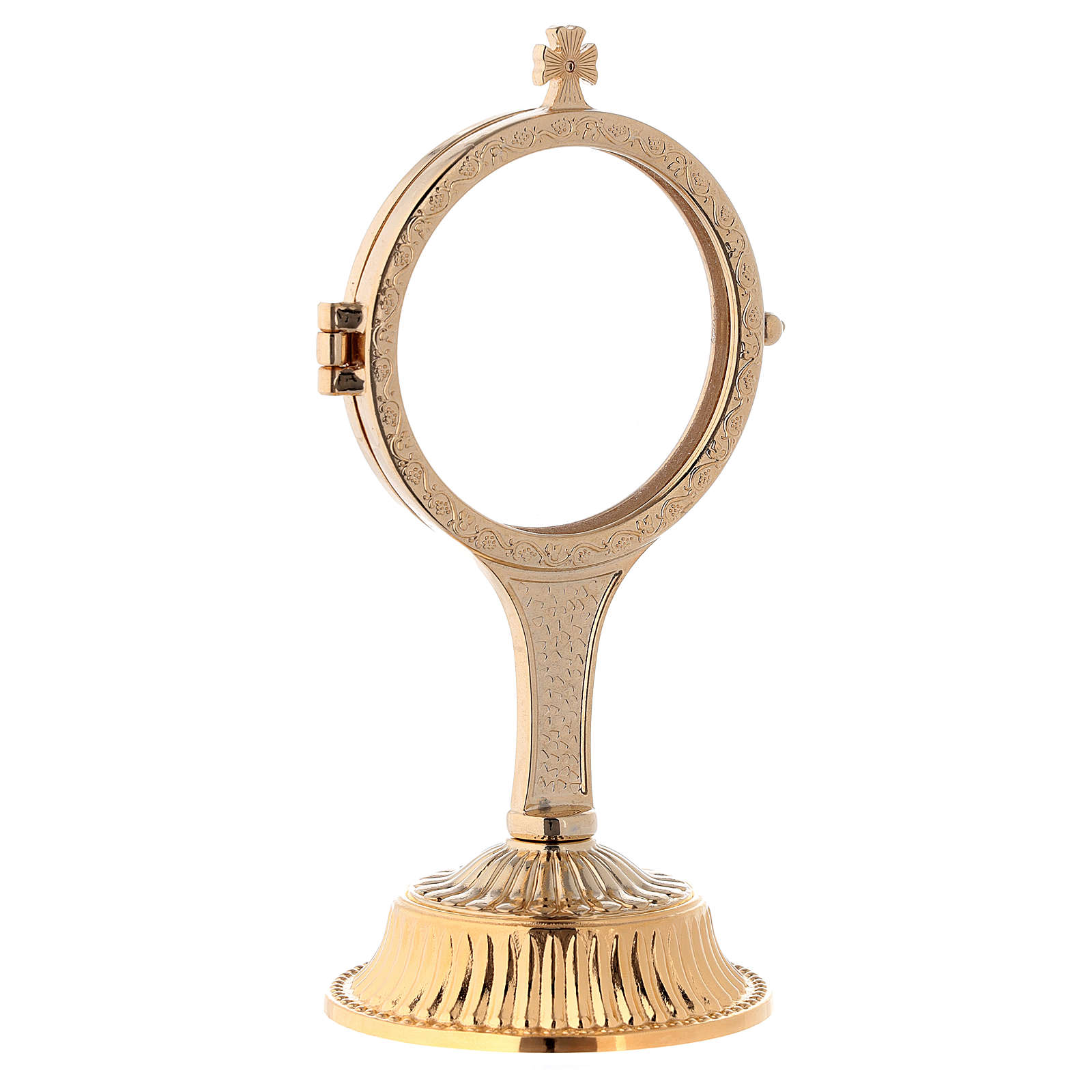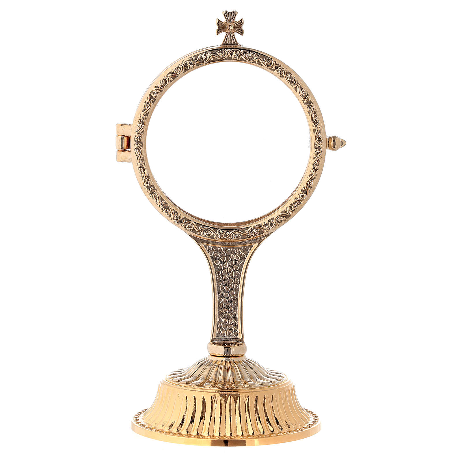 Custode d'exposition hostia magna zamak laiton plexiglas. Ostensoir pour hostia magna avec base en laiton doré 24K et lunule en plexiglas et zamak. Article richement décoré de motifs naturalistes et géométriques, surmonté d'une petite croix décorée de rayons.Ostensoir réalisé en Italie par des artisans spécialisés.