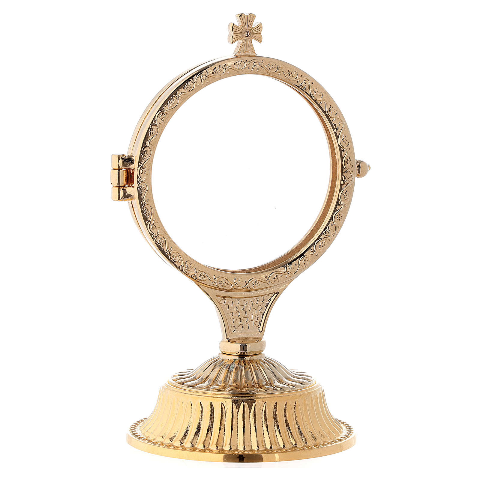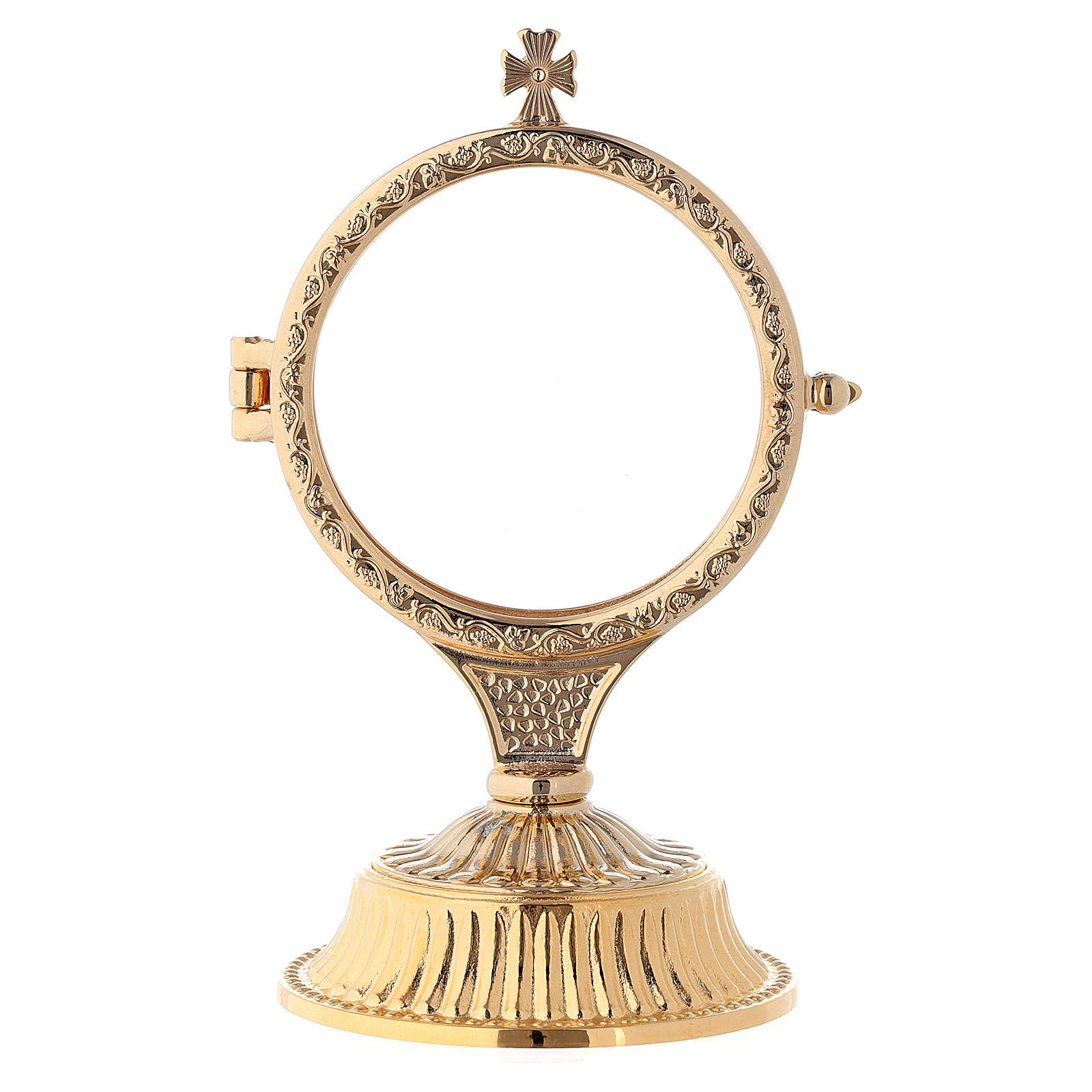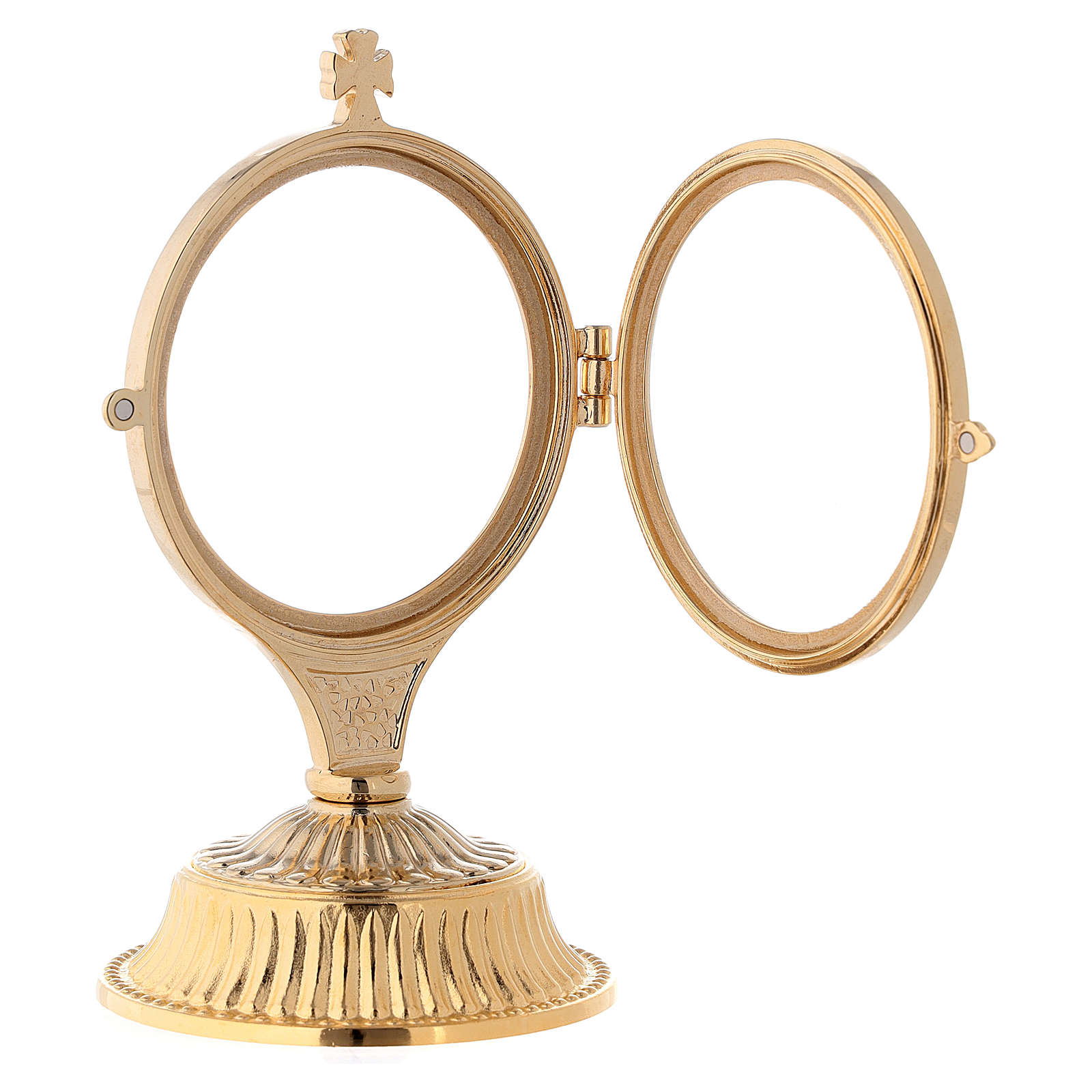 Custode exposition tige courte croix rayons 15 cm. Custode pour exposition d'hostia magna avec lunule en zamak doré et plexiglas sur base en laiton doré 24K décorée.La lunule est enrichie d'un dessin de branches de vigne et est surmontée d'une croix avec motif à rayons.Article réalisé en Italie par des artisans spécialisés.