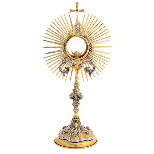 Les rayons dorés encadrant la lunule pour grande ostie sont ornés de motifs délicats argentés et d'une plaque encerclant le verre de l'ostensoir, représentant deux épis de blé et, en haut, la colombe du Saint-Esprit, symbole de paix et de présence divine. Le tout est surmonté d'une croix dorée agrémentée d'une gemme rouge au centre.