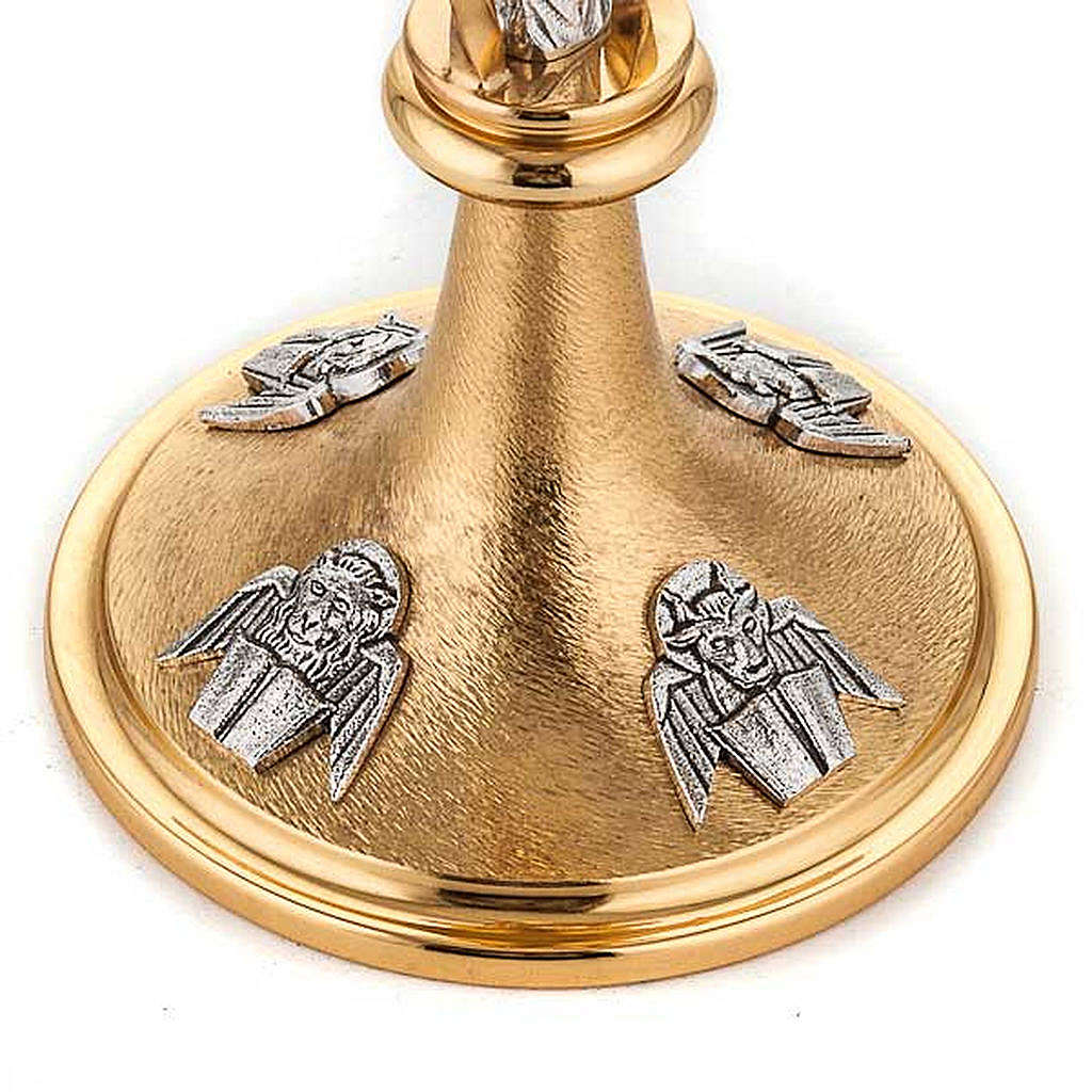 Ostensoir précieux, riche en détails pour exprimer grâce aux symboles la grandeur des mystères qui s'accomplissent. Ostensoir en bronze argenté avec les symboles des quatre évangiles et une statue de Marie. L'ostensoir est réalisé de manière artisanale dans une entreprise connue dans le domaine de la fabrication de matériel religieux.